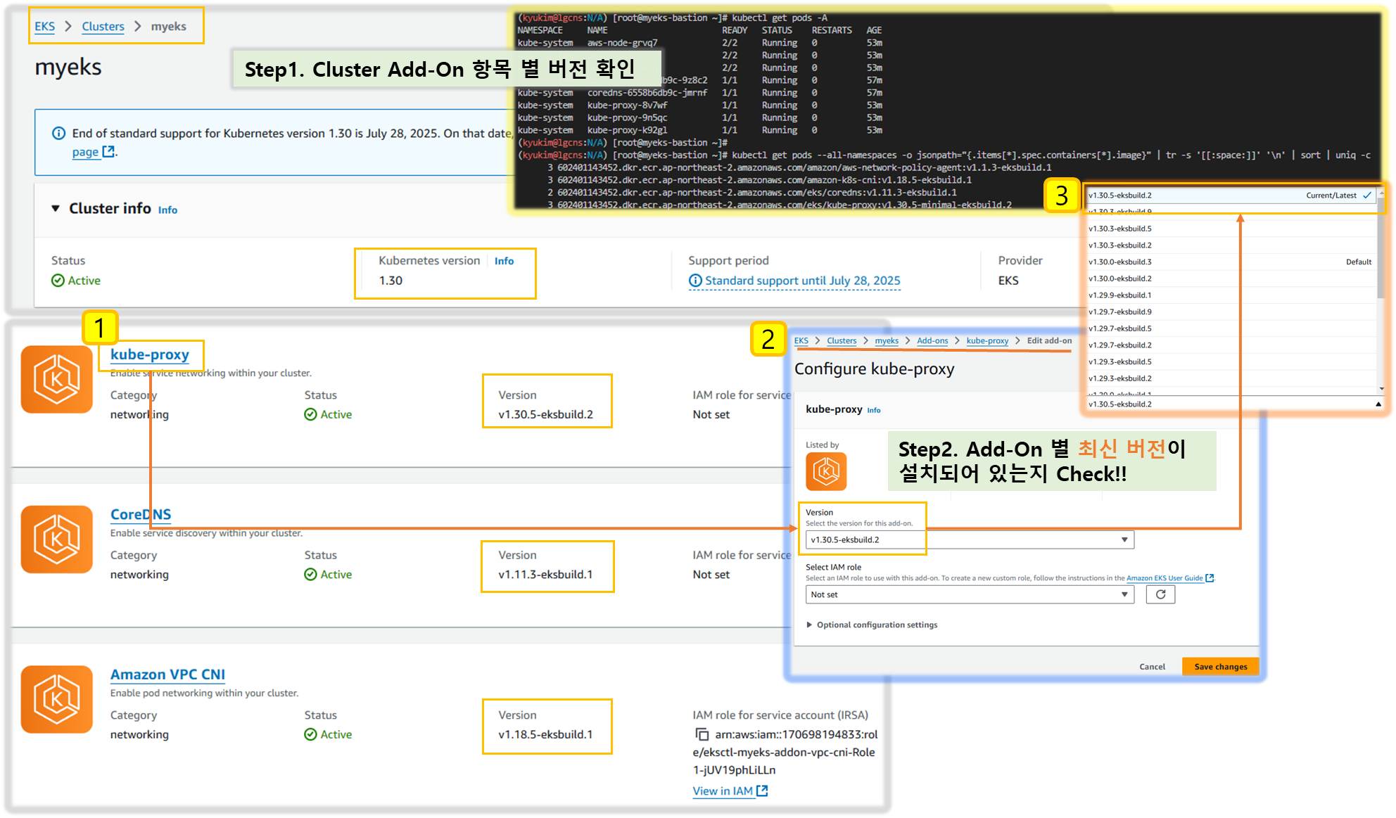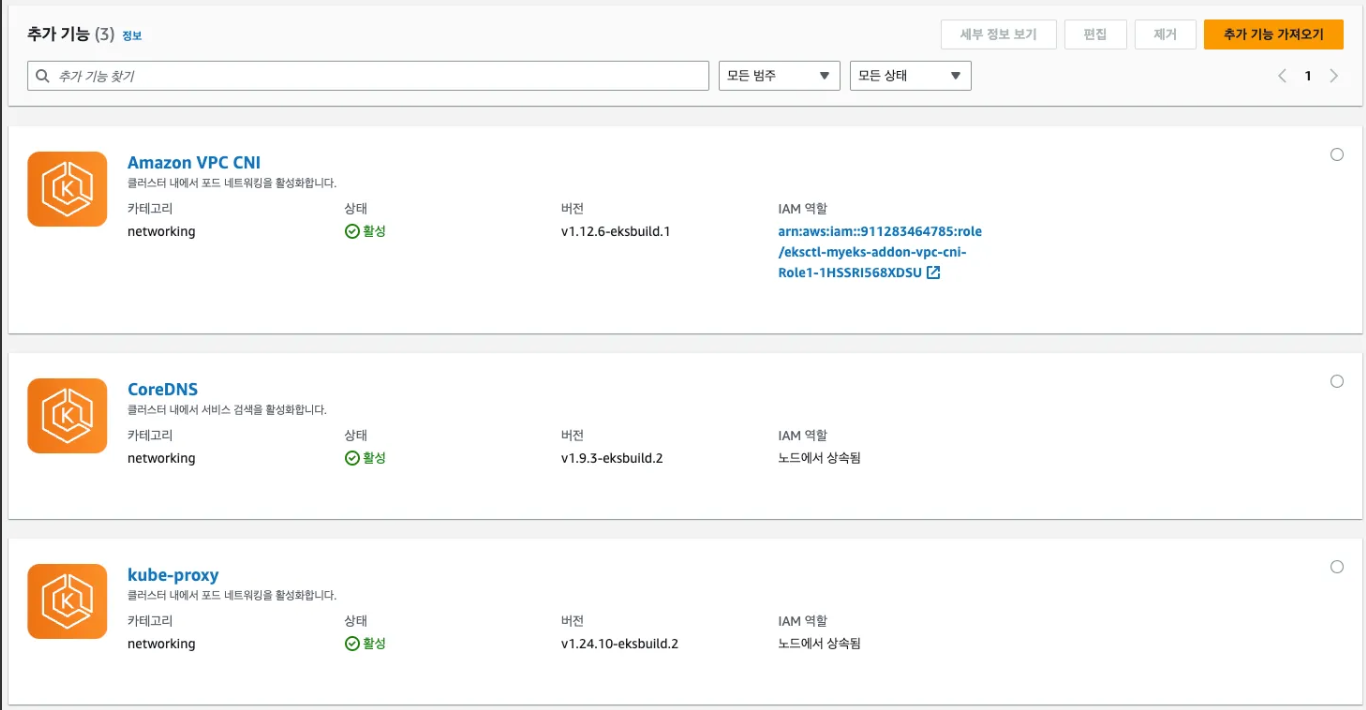- Add-on 같이 설치 됨 : 최신 버전 - kube-proxy, coredns, aws vpc cni - 링크