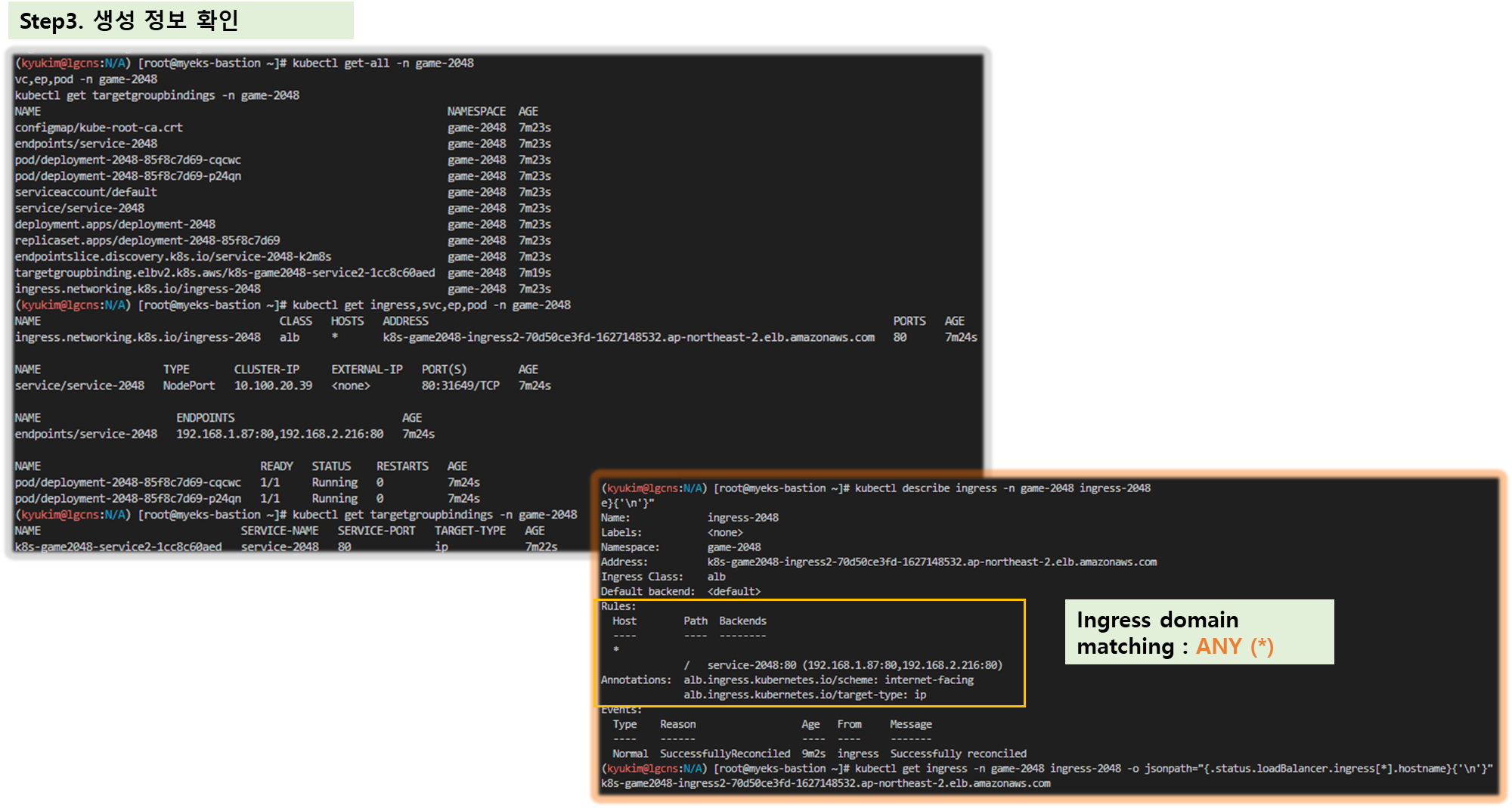 - 노드에 EC2 IAM Profile 권한 추가 : external-dns-access, full-ecr-access, alb-ingress-access, awsLoadBalancerController