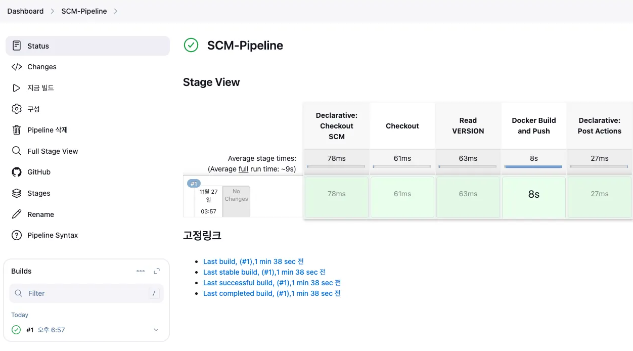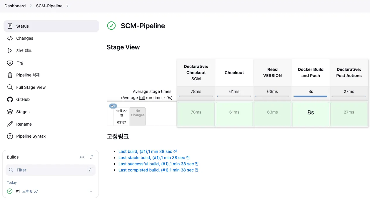 ▶ Final : 도커 빌드 후 기존 컨테이너 중지/제거 후 신규 컨테이너 실행 Jenkinsfile pipeline 수정 후 빌드 (SCM-Pipeline)