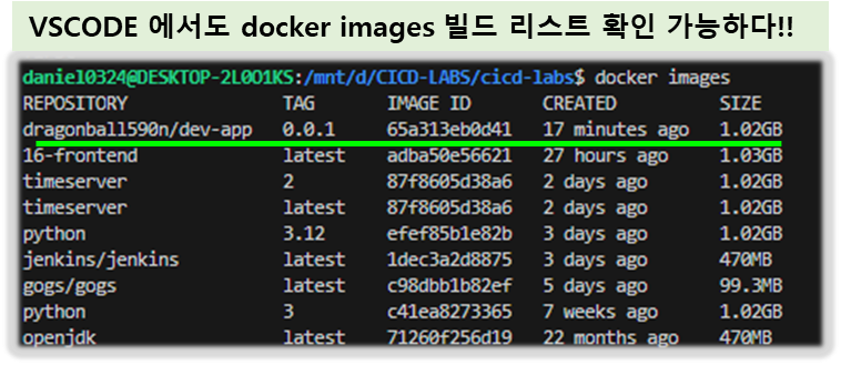 4) Jenkins 컨테이너가 이미지 빌드하여, 호스트에서도 컨테이너 이미지 생성 확인