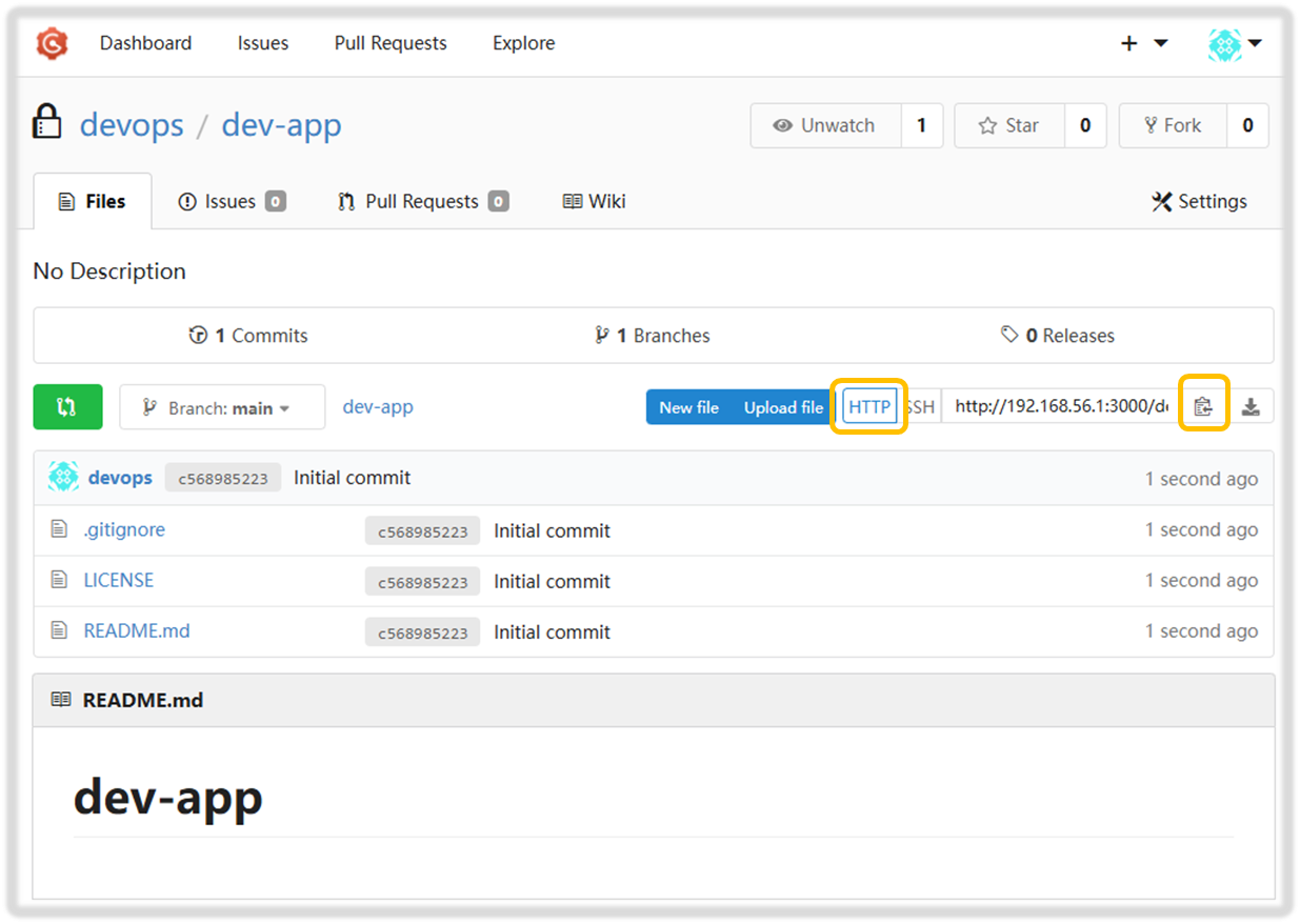 - Repo URL(http://***<mac IP>***:3000/***<Gogs 계정명>***/dev-app)