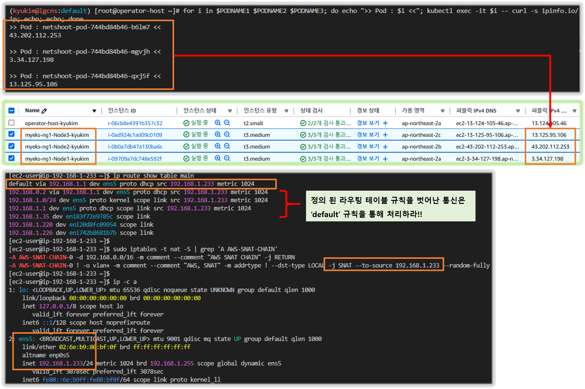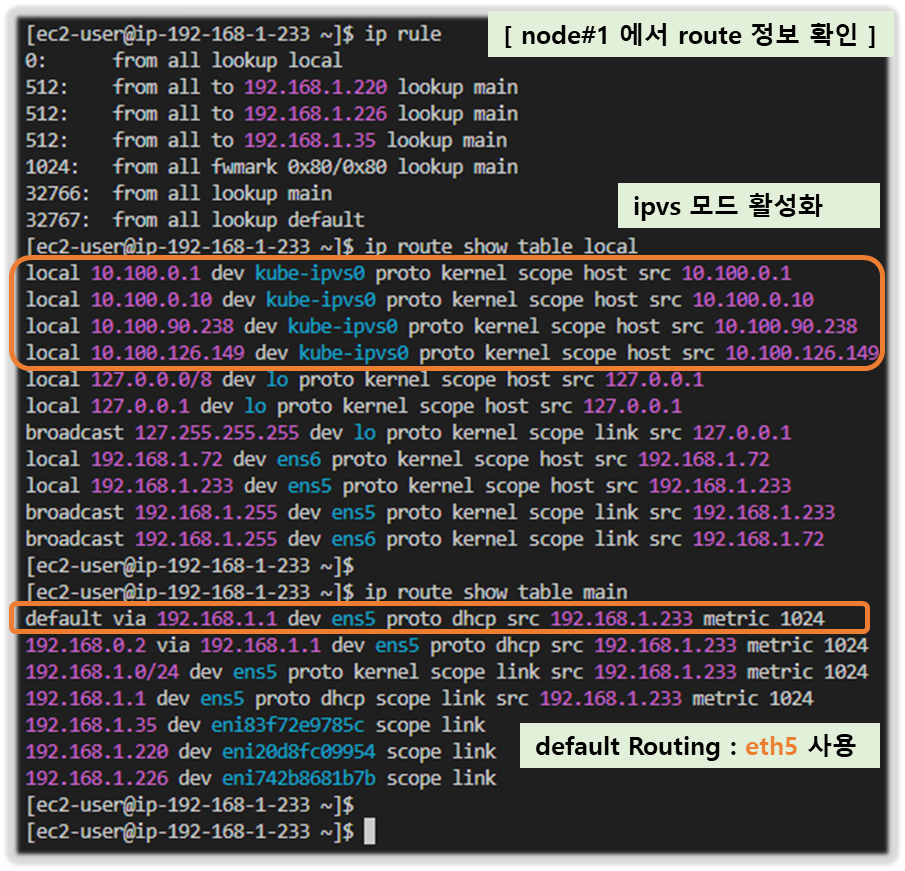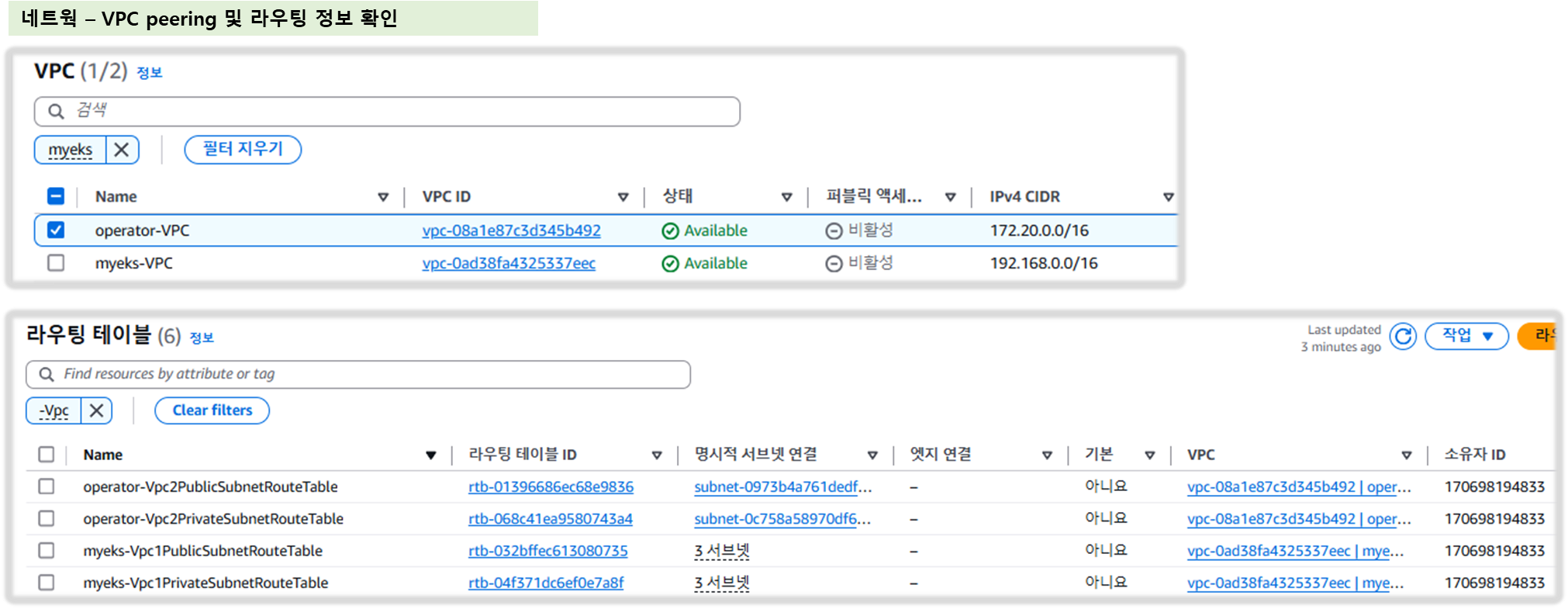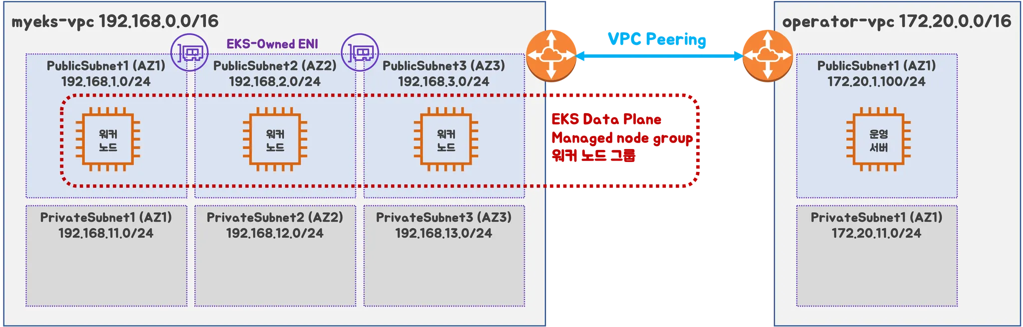 - myeks-vpc 에 각기 AZ를 사용하는 퍼블릭/프라이빗 서브넷 배치
