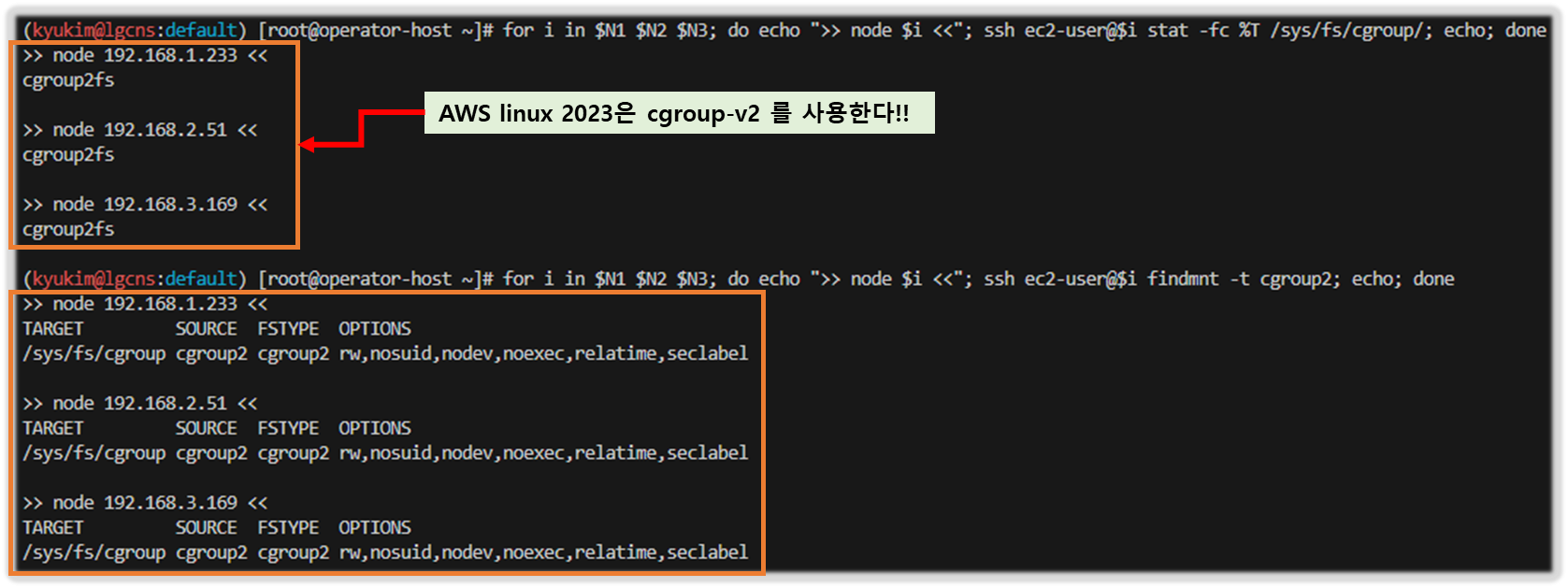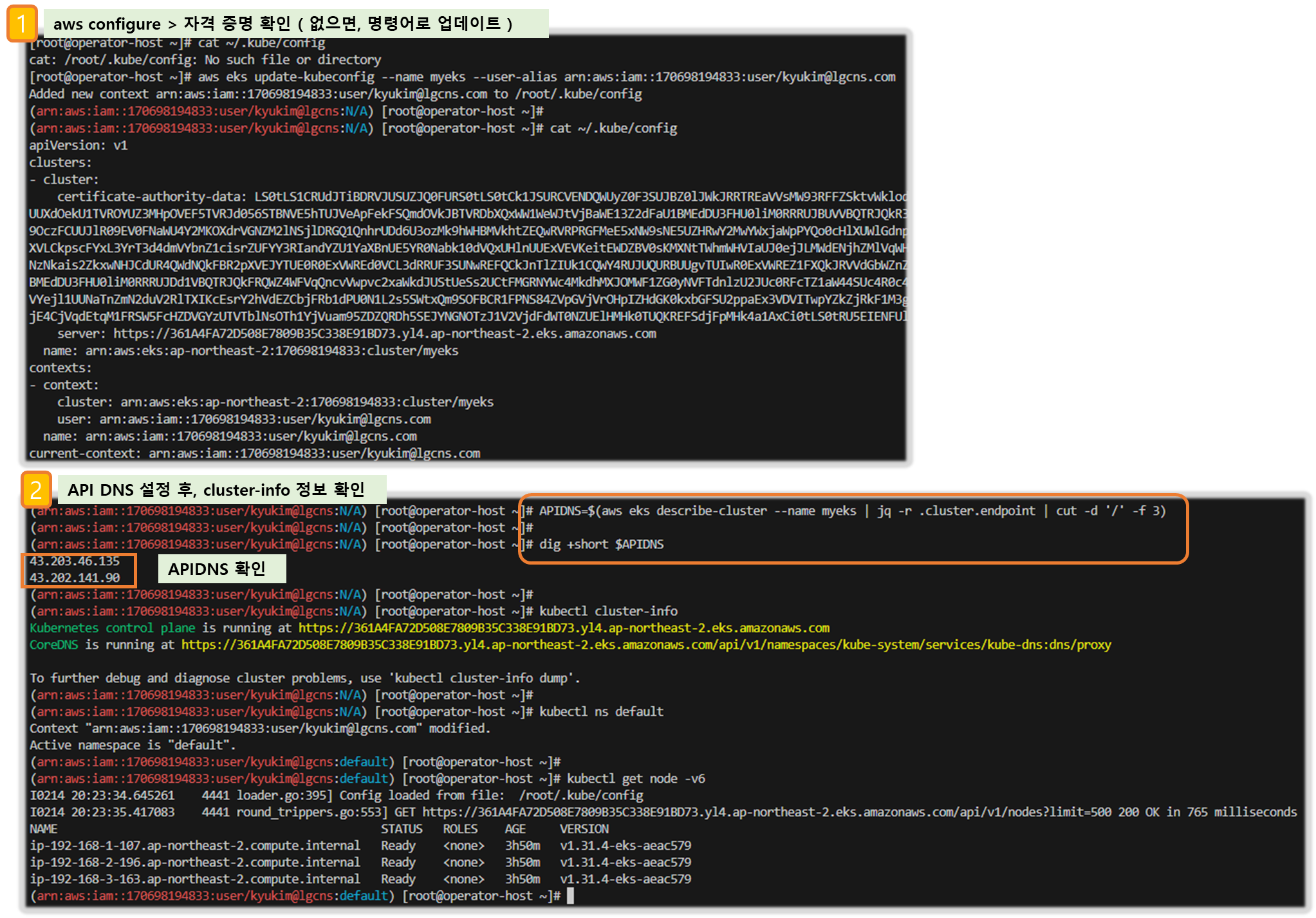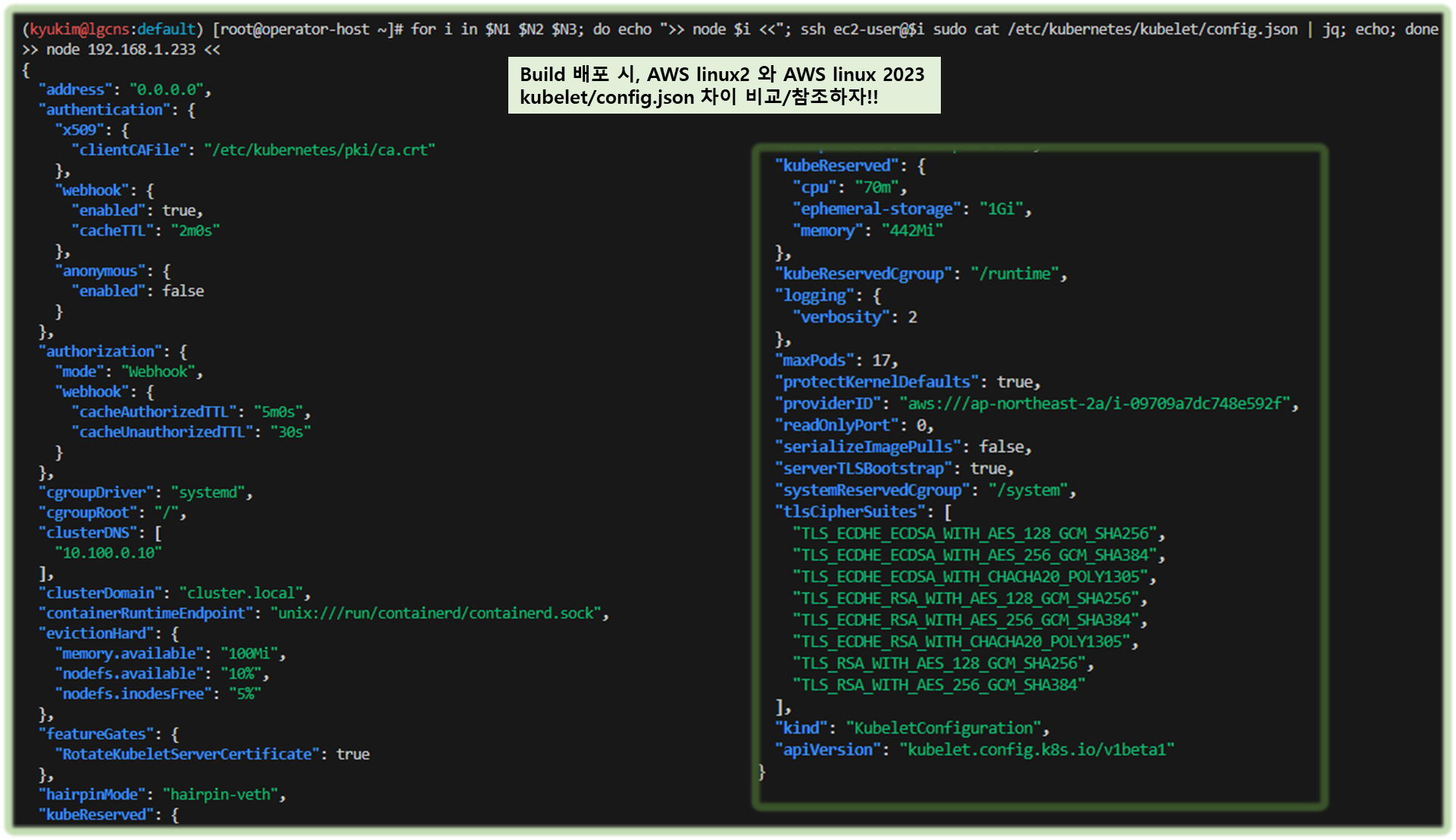 ☞ 구성도 : 2개의 VPC(EKS 배포, 운영용 구분), 운영서버 EC2 + EKS 제어부, EKS 데이터부(관리형 노드 그룹, AL2023 - 페도라 기반, dnf - Docs)