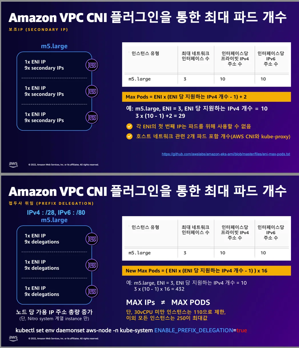 - Prefix Delegation : https://www.eksworkshop.com/docs/networking/vpc-cni/prefix/
