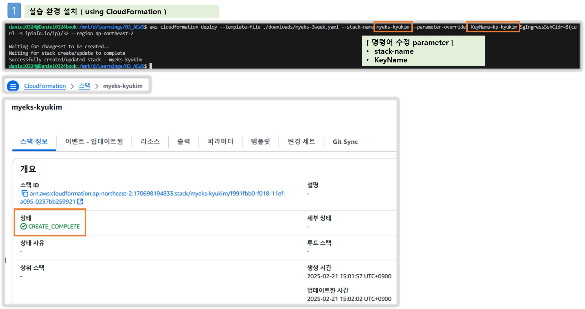 --stack-name myeks --parameter-overrides KeyName=kp-gasida SgIngressSshCidr=$(curl -s ipinfo.io/ip)/32 --region ap-northeast-2
