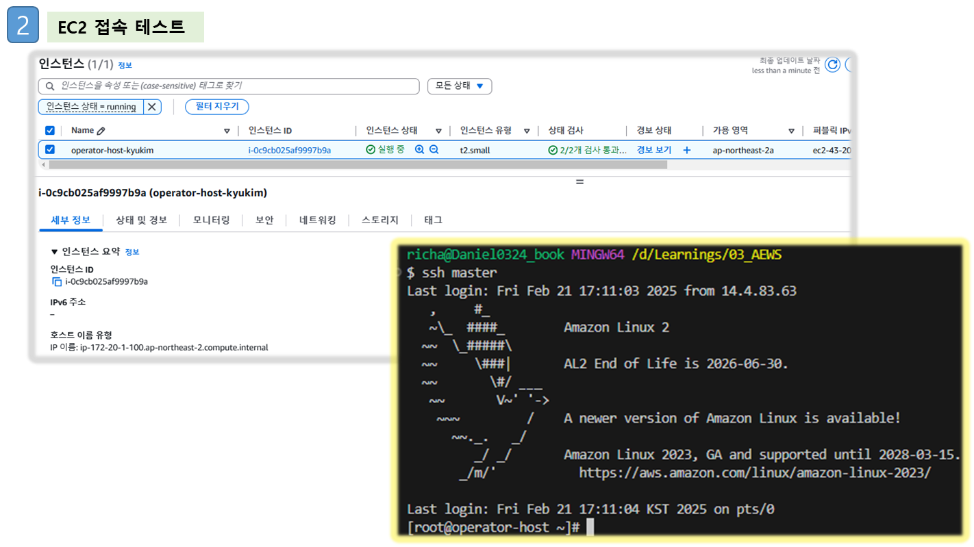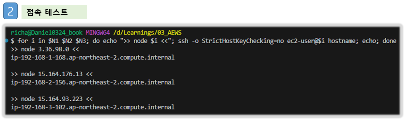 ssh -i <ssh 키파일> ec2-user@$(aws cloudformation describe-stacks --stack-name myeks --query 'Stacks[*].Outputs[0].OutputValue' --output text)