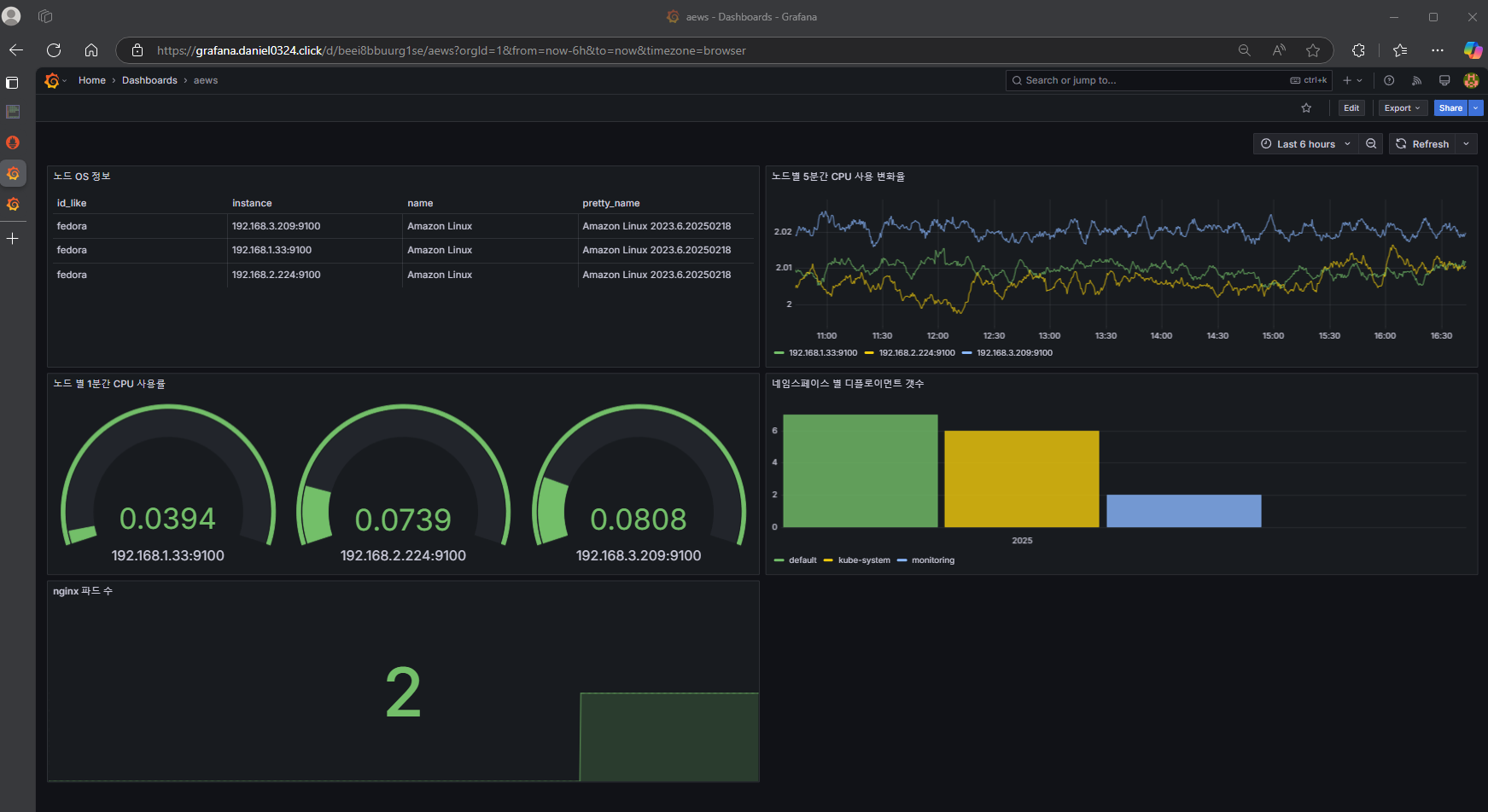 이번 시간은 EKS 자원의 관리 중 중요한 한 축인 모니터링 관련 부분을 자세히 볼 수 있었다. 특히, 수집한 데이터를 분석하고 가시화 해주는 오픈 소스 툴인 Prometheus 와 Grafana를 통해 Observability 라는 개념을 더 실제적으로 느껴볼 수 있는 예제들이 있어 좋았던 것 같다. 이해한 것과 별도로 현업에 해당 툴을 이용한 모니터링 및 분석을 적용하기 위해 좀더 많은 연습이 필요하 것이라는 생각이 들고, 최근 비용관련 이슈가 큰 화두가 되고 있어 로그 수집 저장의 최적화를 위한 많은 고민이 필요할 것 같다.