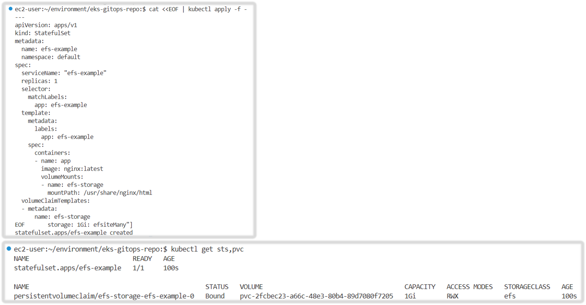persistentvolumeclaim/efs-storage-efs-example-0 Bound pvc-bca0344c-55b8-43e9-9b30-821fb2fc8886 1Gi RWX efs 28s