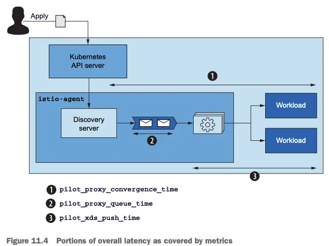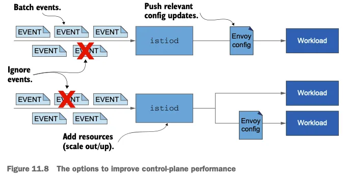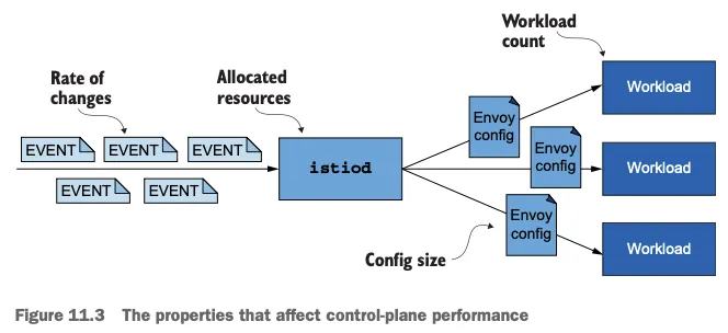 - 이스티오 파일럿 성능에 영향을 주는 요소에는 변경 속도, 파일럿에 할당한 리소스양, 파일럿이 관리하는 워크로드 개수, 설정 크기가 있다.
