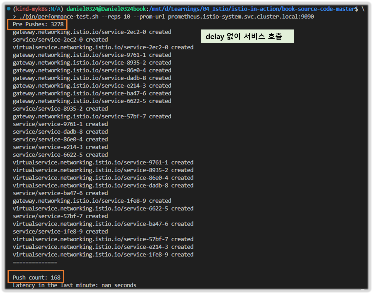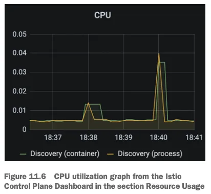 - 이 정도 부하로도 메시 전체를 동기화하는 이스티오 파일럿 인스턴스 하나가 겨우 가상 코어 하나와 메모리 1.5GB만을 사용한다.
