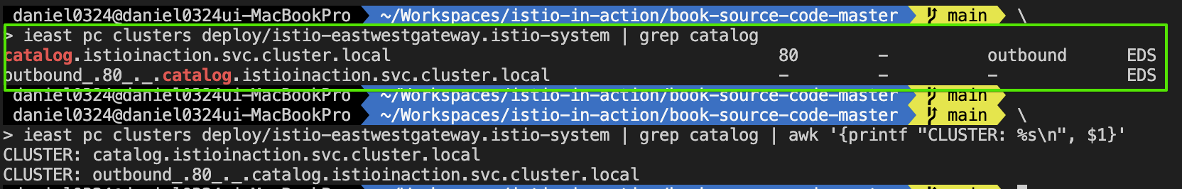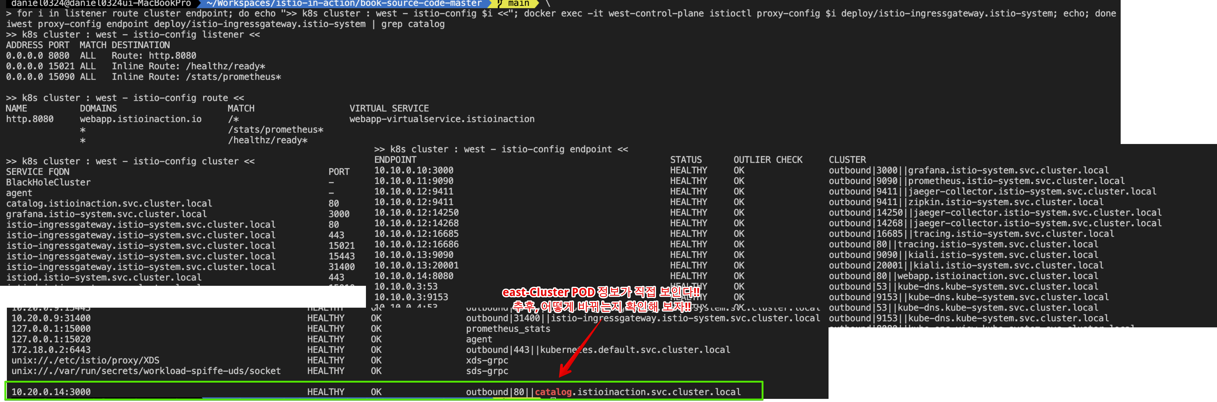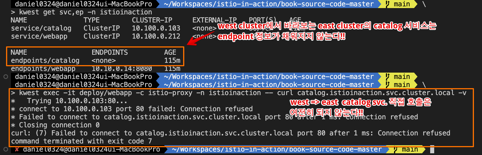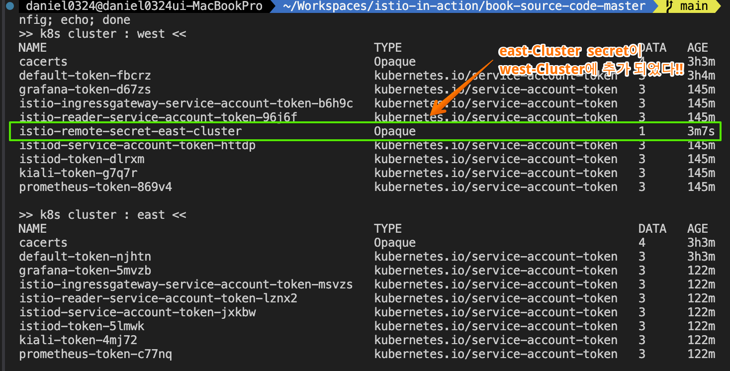 - 이스티오가 다중 클러스터 서비스 메시를 구현하는 방법은 모든 클러스터의 서비스를 퀴리한 다음 이 정보로 서비스 프록시에 클러스터 사이에서 서비스 간 트래픽을 라우팅하는 방법을 설정하는 것이다.