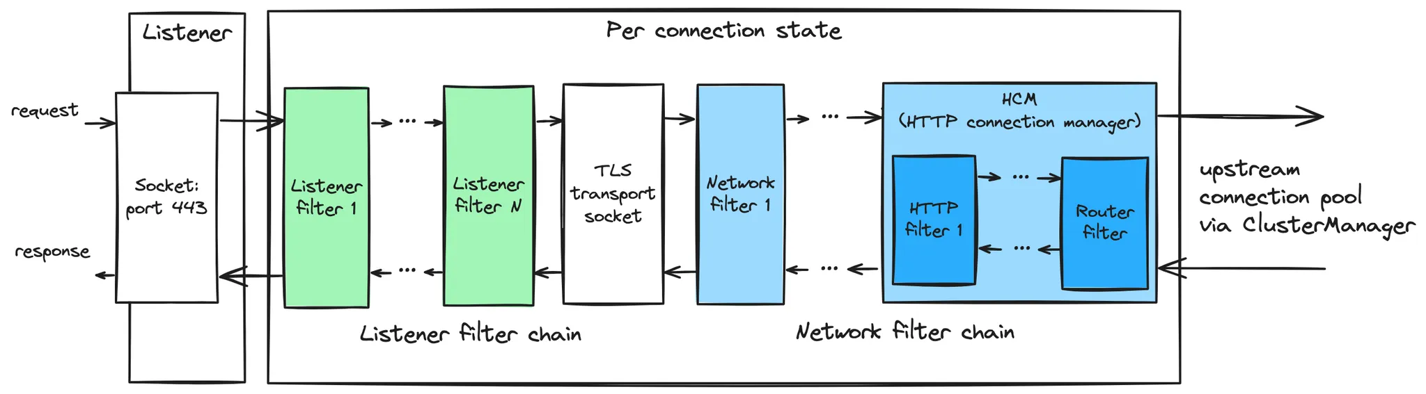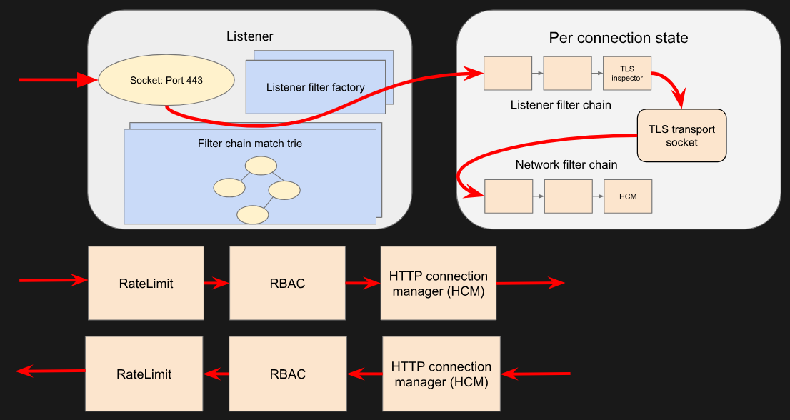 - 엔보이의 내부 아키텍처는 리스너와 필터를 중심으로 구축됐다.Envoy’s internal architecture is built around listeners and filters.