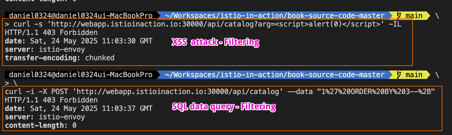 [2025-05-18T09:34:21.014Z] "HEAD /api/catalog?arg=<script>alert(0)</script> HTTP/1.1" 403 - - "-" 0 0 35 - "172.18.0.1" "curl/8.7.1" "27f43c69-359d-9d95-99cd-553081bb9346" "webapp.istioinaction.io:30000" "-" outbound|80||webapp.istioinaction.svc.cluster.local - 10.10.0.10:8080 172.18.0.1:65166 - -