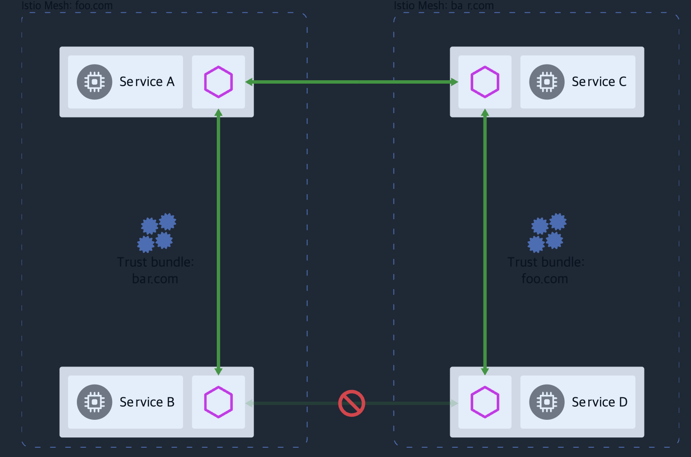 ☞ 다중 클러스터 연결성과 보안 (Multi-cluster connectivity and security) 상술했듯이, 이스티오가 클러스터 간에 다중 클러스터 연결을 수립하려면 워크로드는 동료 클러스터의 쿠버네티스 API에 접근하는 방법으로만 찾을 수 있다. 어떤 조직에서는 이것이 바람직하지 않는 보안 태세일 수 있다. 각 클러스터가 다른 클러스터의 API 모두에 접근할 수 있기 때문이다. For some organizations, this may be an undesirable security posture where each cluster has access to all other clusters’ APIs. 이 경우에는 메시 연합이 더 나은 방식이다. In this case, mesh federation is a better approach.