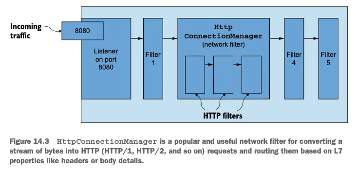 - 이스티오의 EnvoyFilter 리소스를 사용해 엔보이의 HTTP 필터 구조를 직접 구성하면 더 세밀한 설정이 가능하며, 이스티오의 API로는 노출되지 않는 엔보이의 부분들도 설정할 수 있다. Envoy’s HTTP filter architecture can be configured directly with Istio’s EnvoyFilter resource for more fine-grained configuration or to configure aspects of Envoy not exposed by Istio’s API.