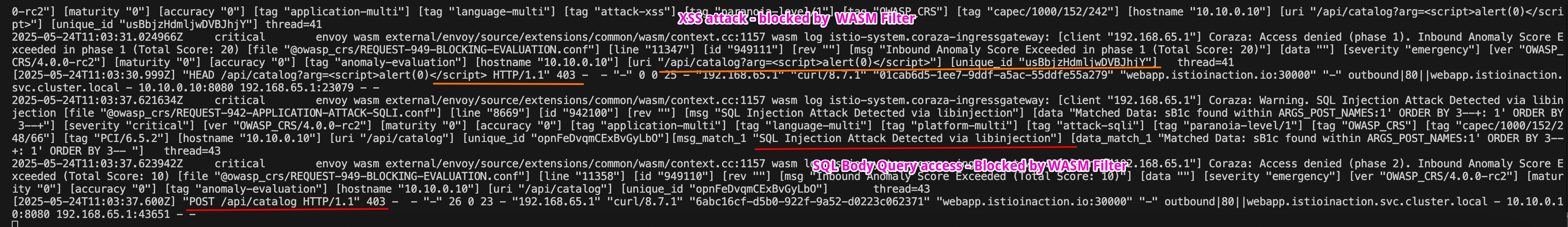 2025-05-18T09:34:21.049522Z critical envoy wasm external/envoy/source/extensions/common/wasm/context.cc:1157 wasm log istio-system.coraza-ingressgateway: [client "172.18.0.1"] Coraza: Access denied (phase 1). Inbound Anomaly Score Exceeded in phase 1 (Total Score: 20) [file "@owasp_crs/REQUEST-949-BLOCKING-EVALUATION.conf"] [line "11347"] [id "949111"] [rev ""] [msg "Inbound Anomaly Score Exceeded in phase 1 (Total Score: 20)"] [data ""] [severity "emergency"] [ver "OWASP_CRS/4.0.0-rc2"] [maturity "0"] [accuracy "0"] [tag "anomaly-evaluation"] [hostname "10.10.0.10"] [uri "/api/catalog?arg=<script>alert(0)</script>"] [unique_id "ztBHScSiiDnOiwJfmOy"] thread=30