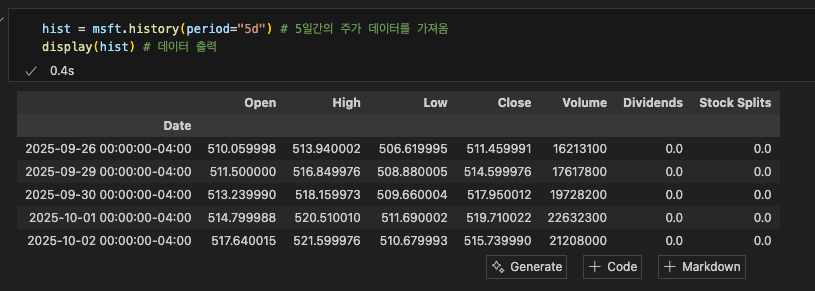 hist = msft.history(period="5d") # 5일간의 주가 데이터를 가져옴