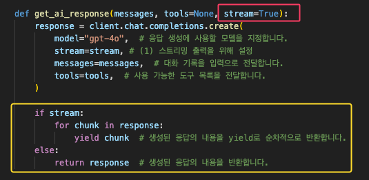 ☞ yield 함수는 GPT가 답변을 완성하는 데 오래 걸리므로, 중간에 순차적으로 끊어서 처리할 때 사용하는 유용한 함수이다!!