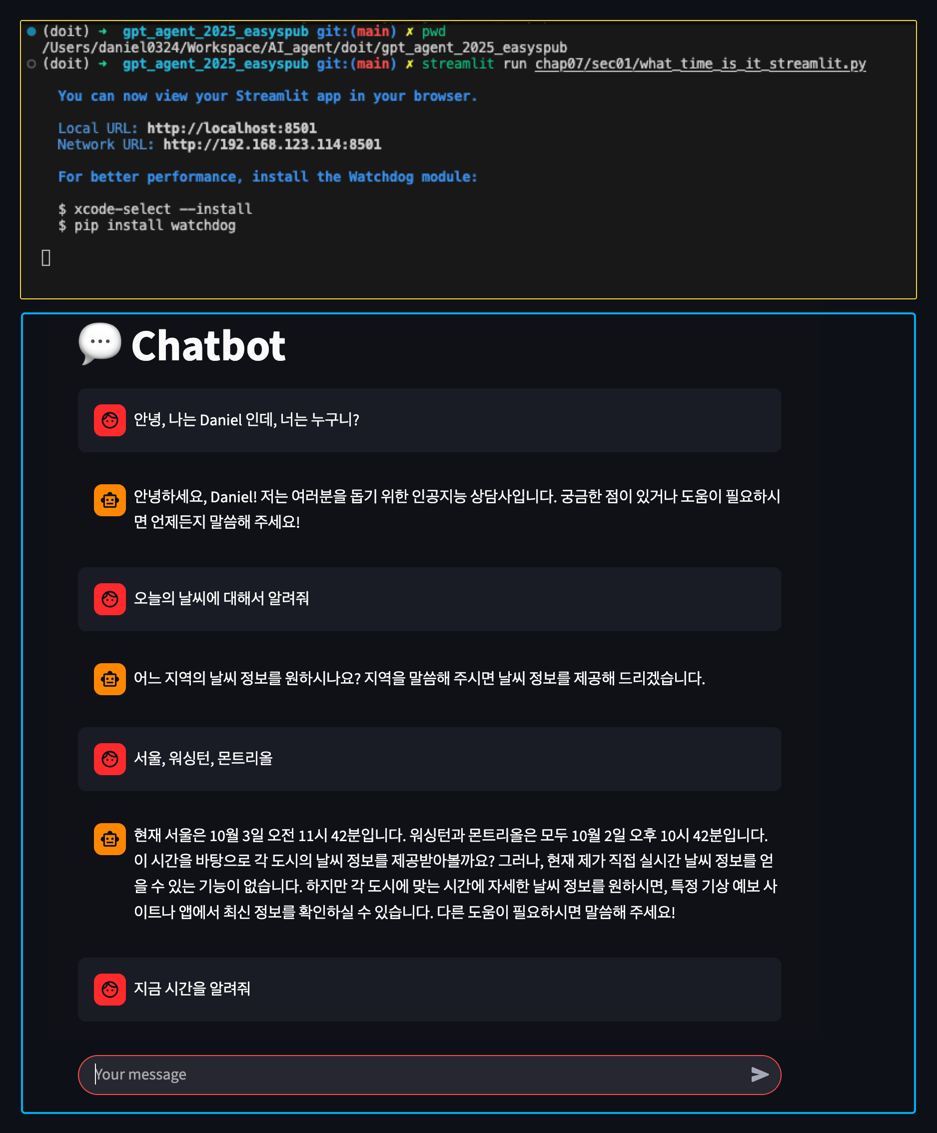 st.chat_message("user").write(user_input) # 사용자 메시지를 브라우저에서도 출력