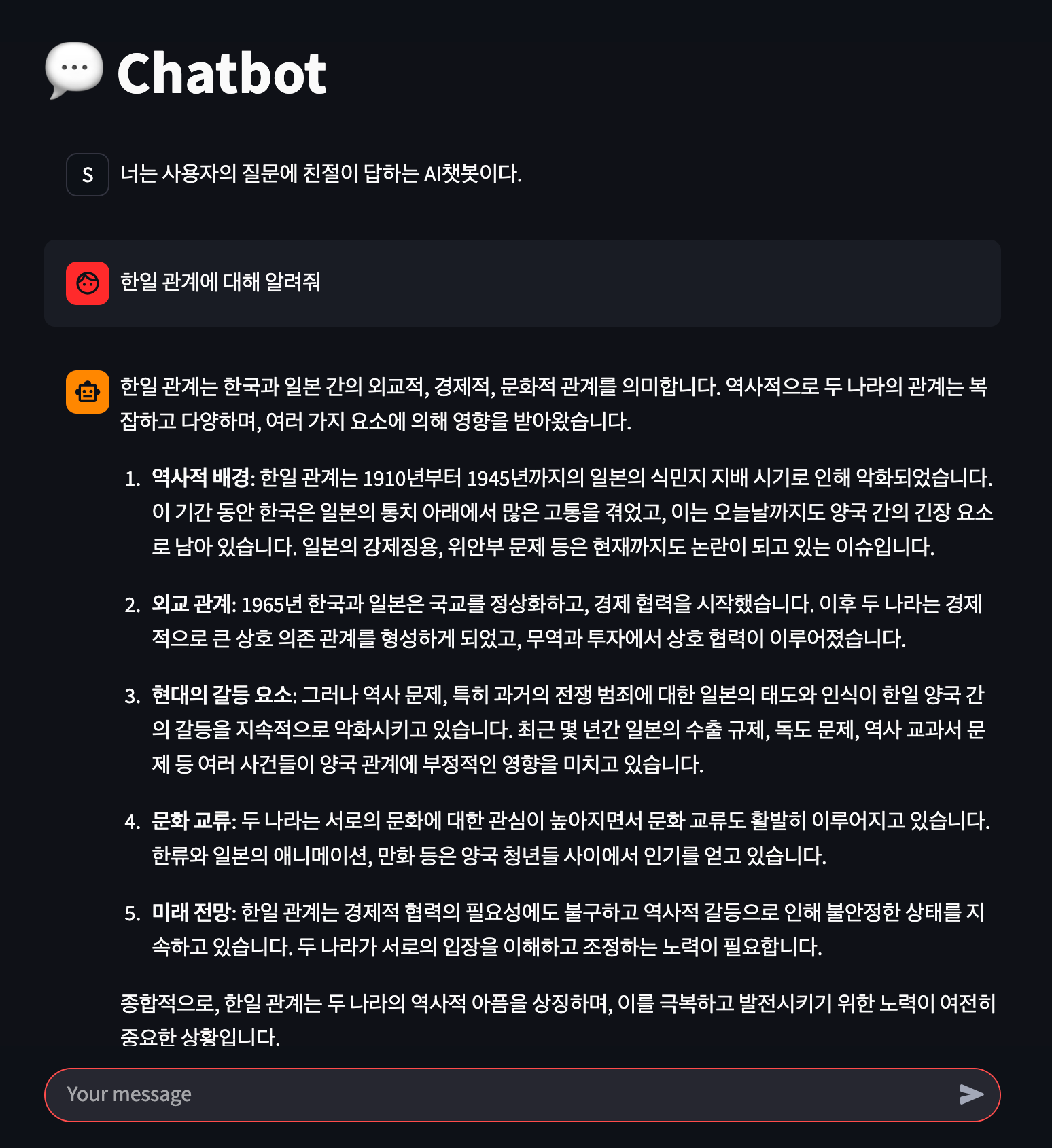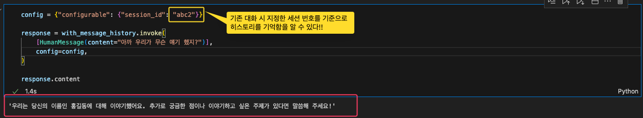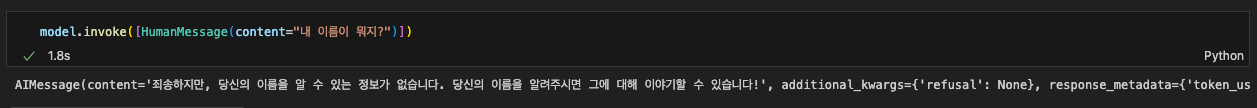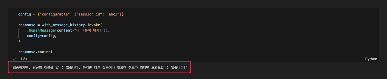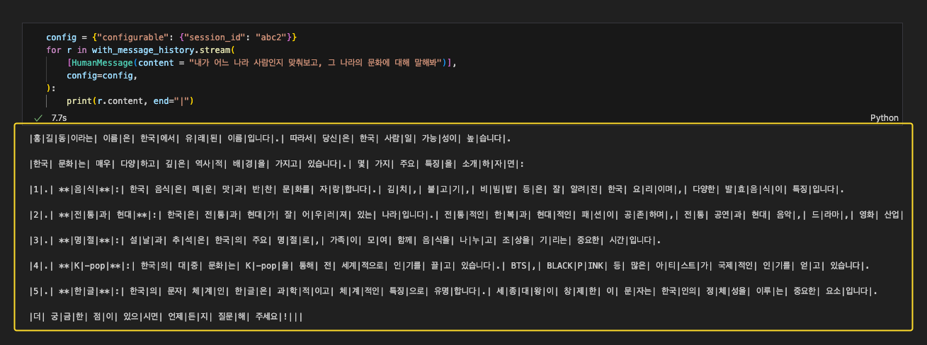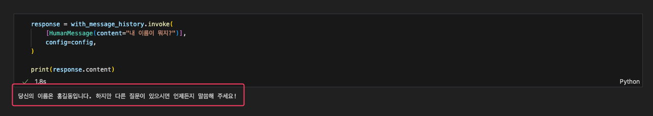 [ 실행 결과 - 이전 대화를 기억함을 알 수 있다. ]