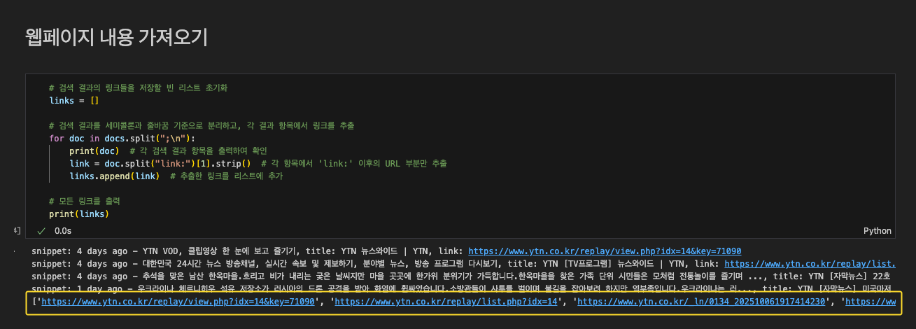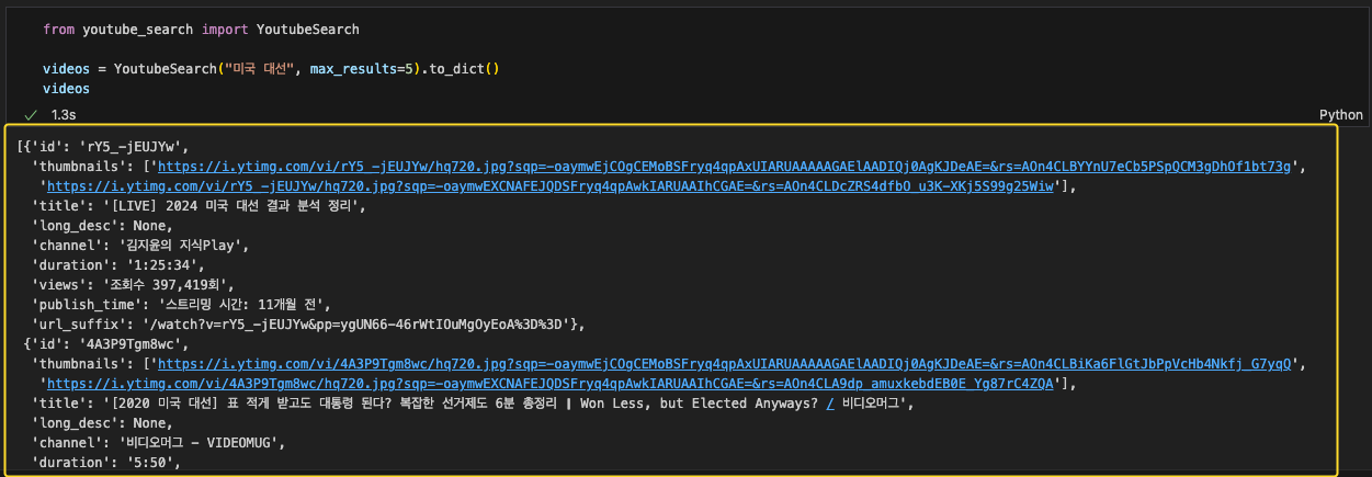 유튜브 검색을 한 뒤, 영상들의 내용을 반환하는 함수.