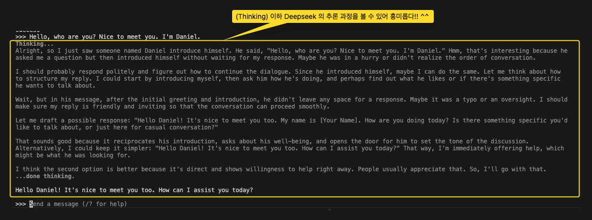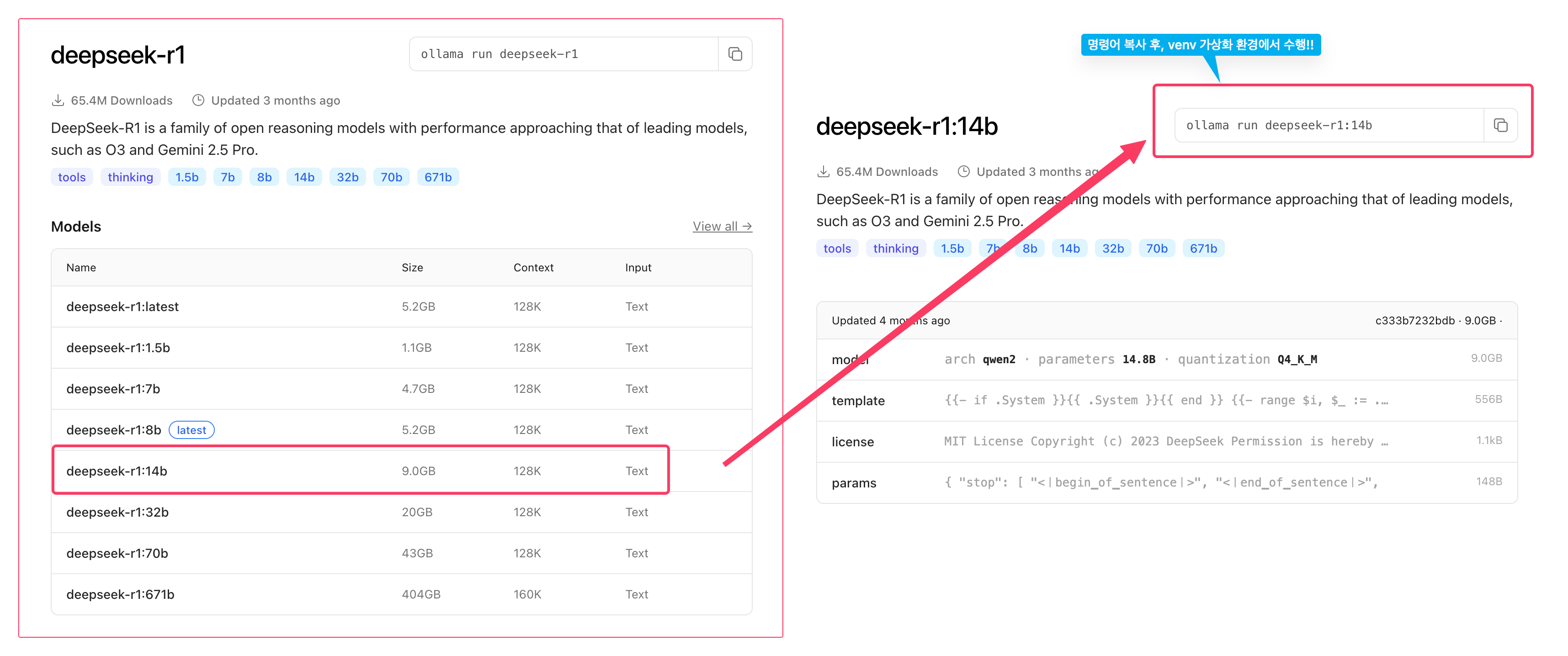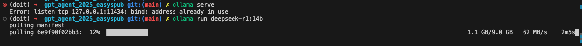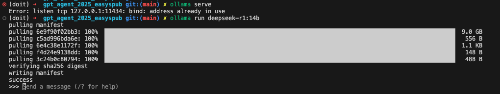 (venv) ollama run deepseek-r1:14b # deepseek-r1:14b를 실행하고, 없으면 다운로드 함