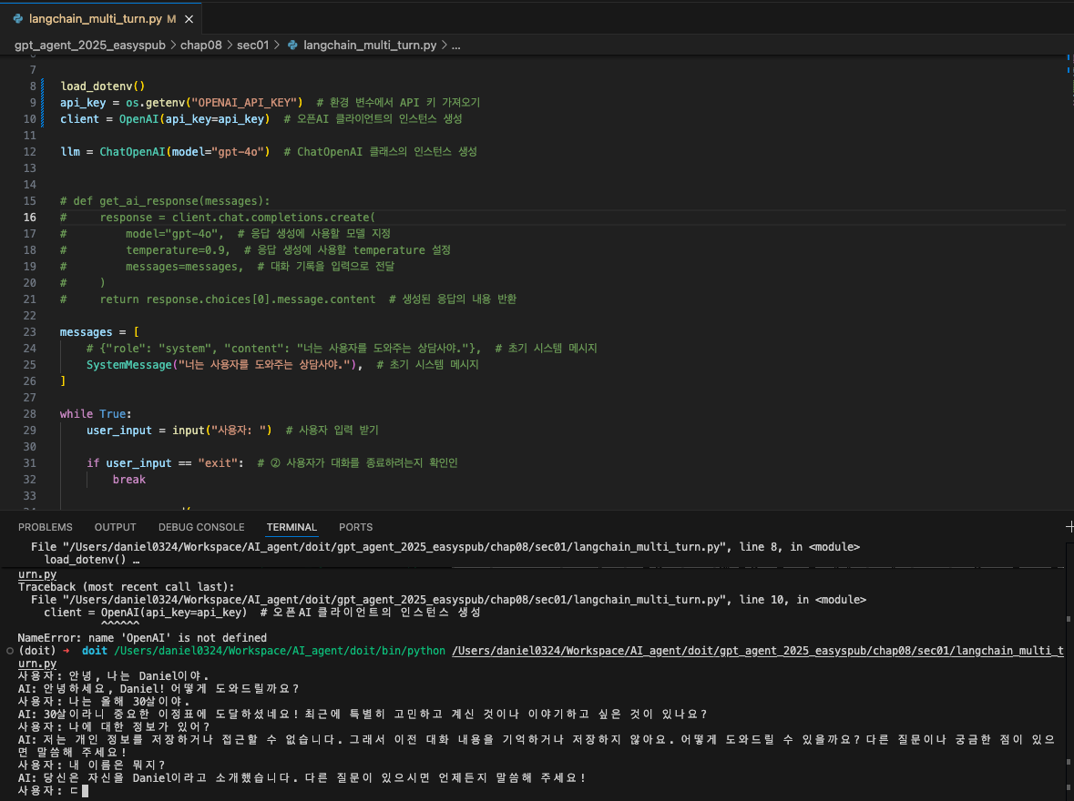 [ 실습2. 랭체인으로 멀티턴 대화하기 ]