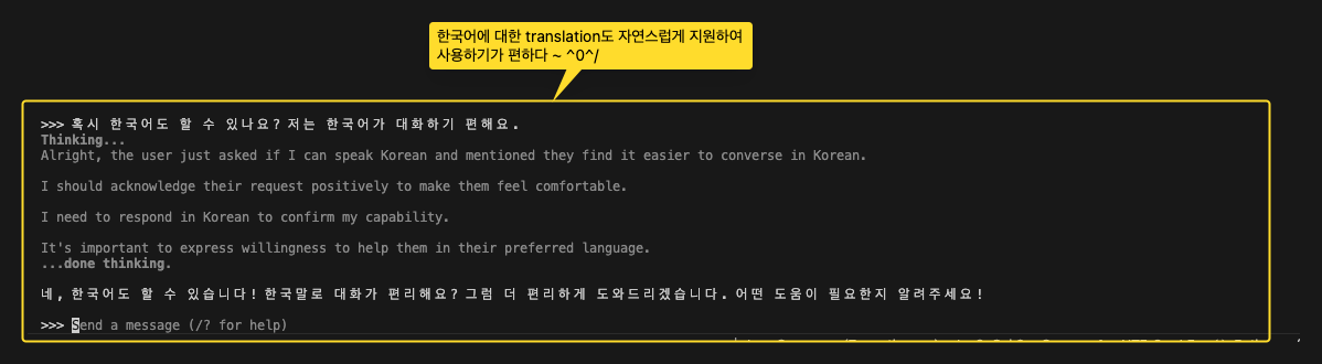 2) 설치가 되면 다음과 같이 사용하면 되고, Ollama app을 실행하고 있으면 serve 명령어를 따로 실행시킬 필요는 없다.