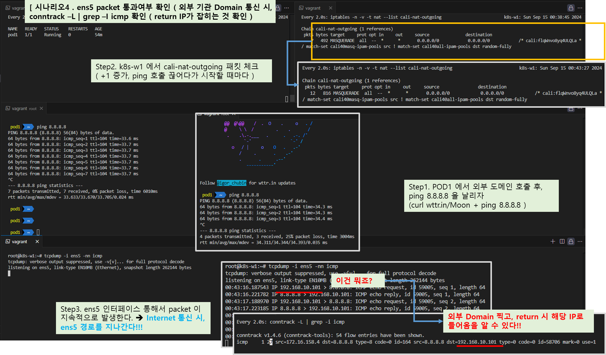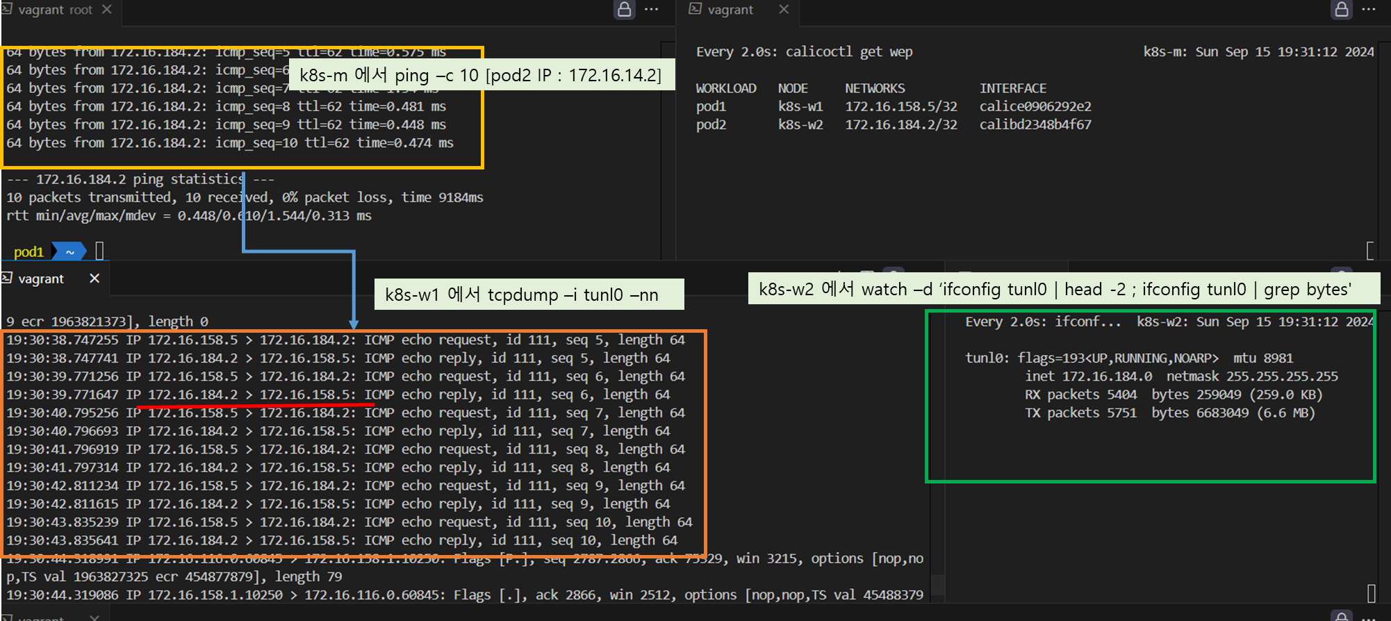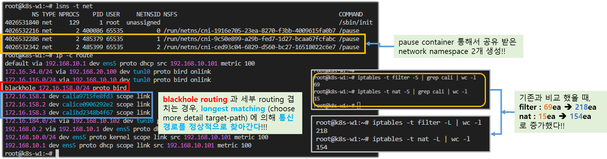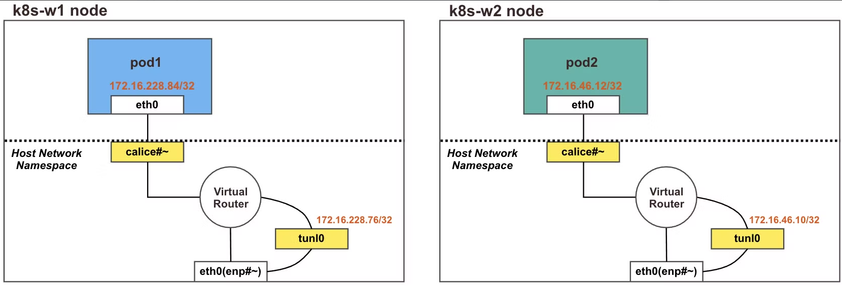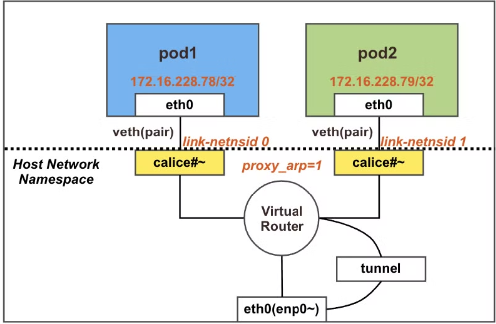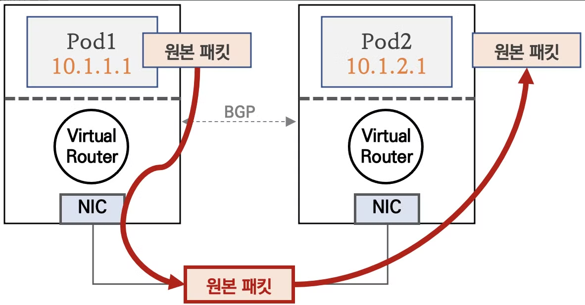 - 한 노드의 POD가 다른 노드의 POD와 통신 하는 경우, Bird 로 학습한 네트워크 정보를 Felix 에 의해 호스트의