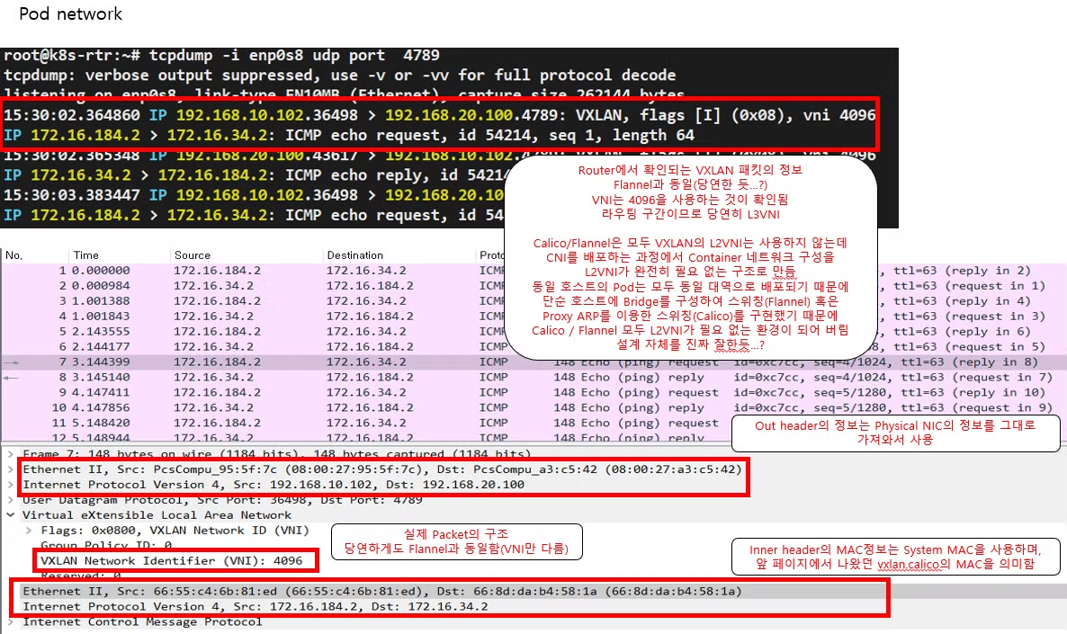 Calico Network 을 공부하면서, CNI 의 구조와 역할에 대한 이해를 바탕으로 Calico CNI가 운영되는 4가지 방식에 대해 접근해 볼 수 있었다. gasida 님의 강의를 다시 보면서 차근 차근 실습해 보는 과정이 힘이 들긴 했지만 Calico 에 대한 실질적인 이해에 많은 도움이 되었던 것 같다. 더불어, Wire-shark 와 연계하여 TCP/UDP dump를 분석해 볼 수 있어서 추후 업무에 있어서도 활용범위가 넓어지게 되어 유익한 시간 이었던 것 같다.