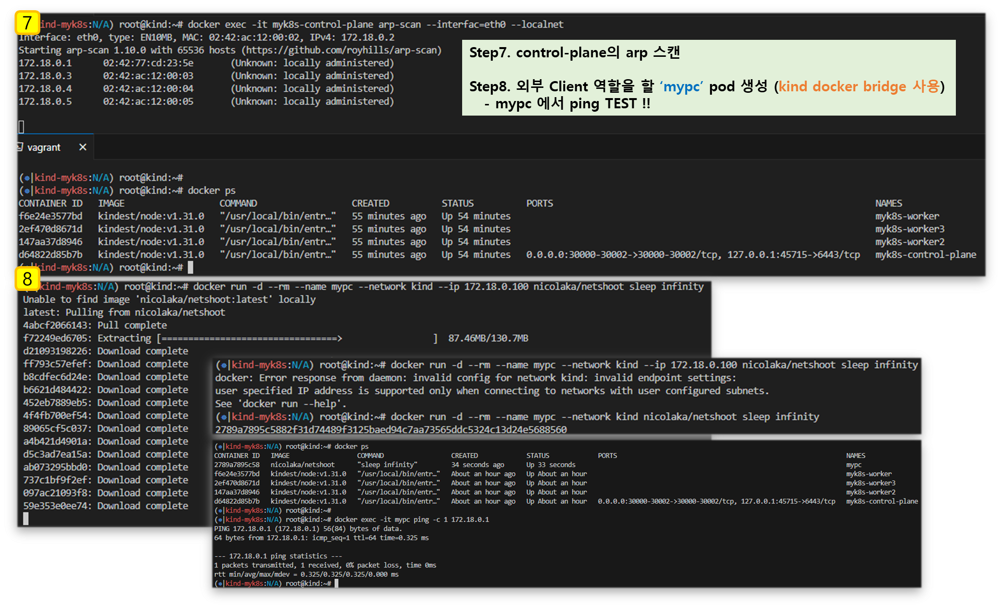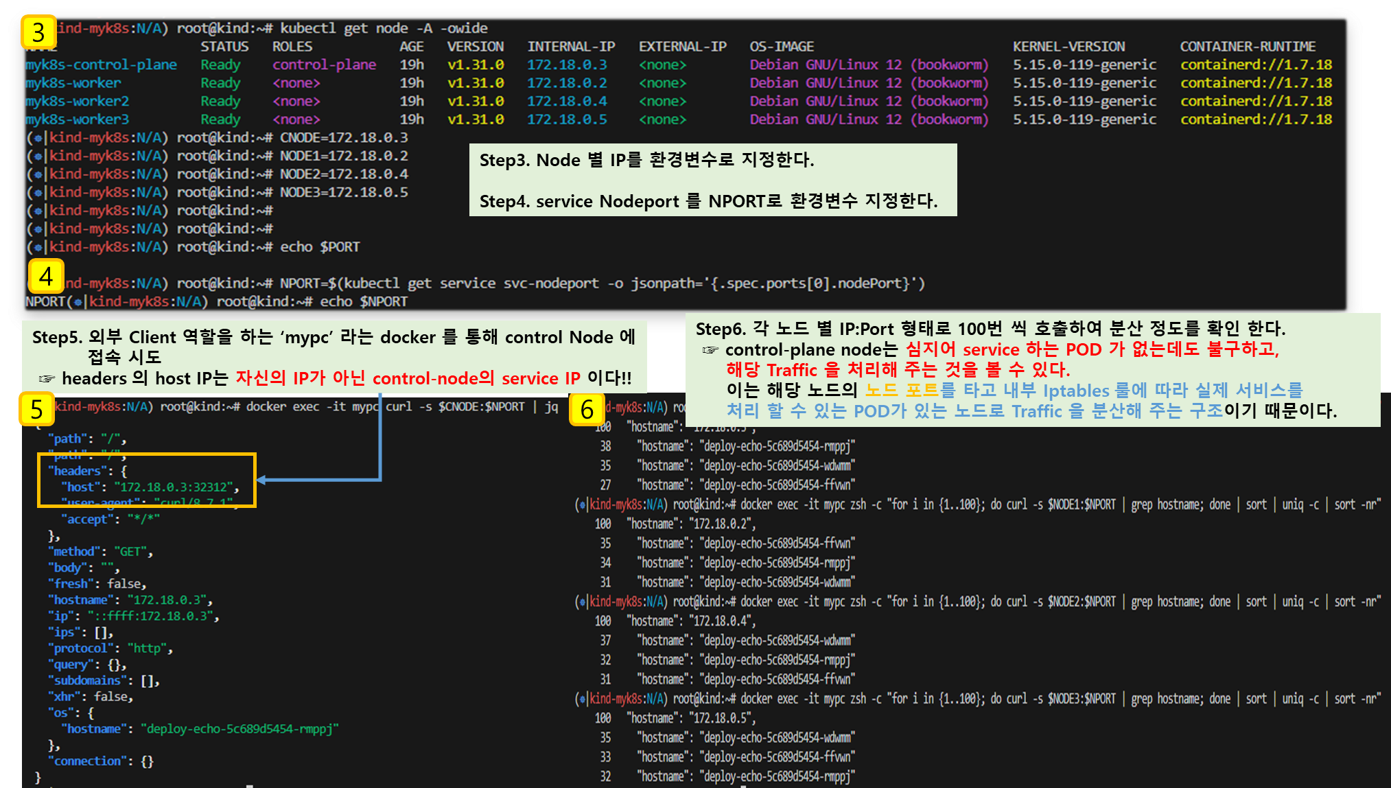 Step1. 외부 클라이언트(mypc 컨테이너)에서 접속 테스트 & 서비스(NodePort) 부하분산 접속 확인