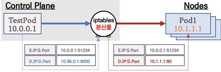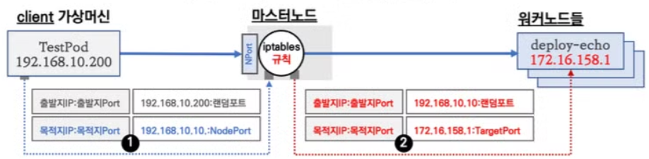 2. 마스터 노드의 iptables 에 등록된 NAT 룰에 따라 목적지의 대상 IP/Port가 변환된다.