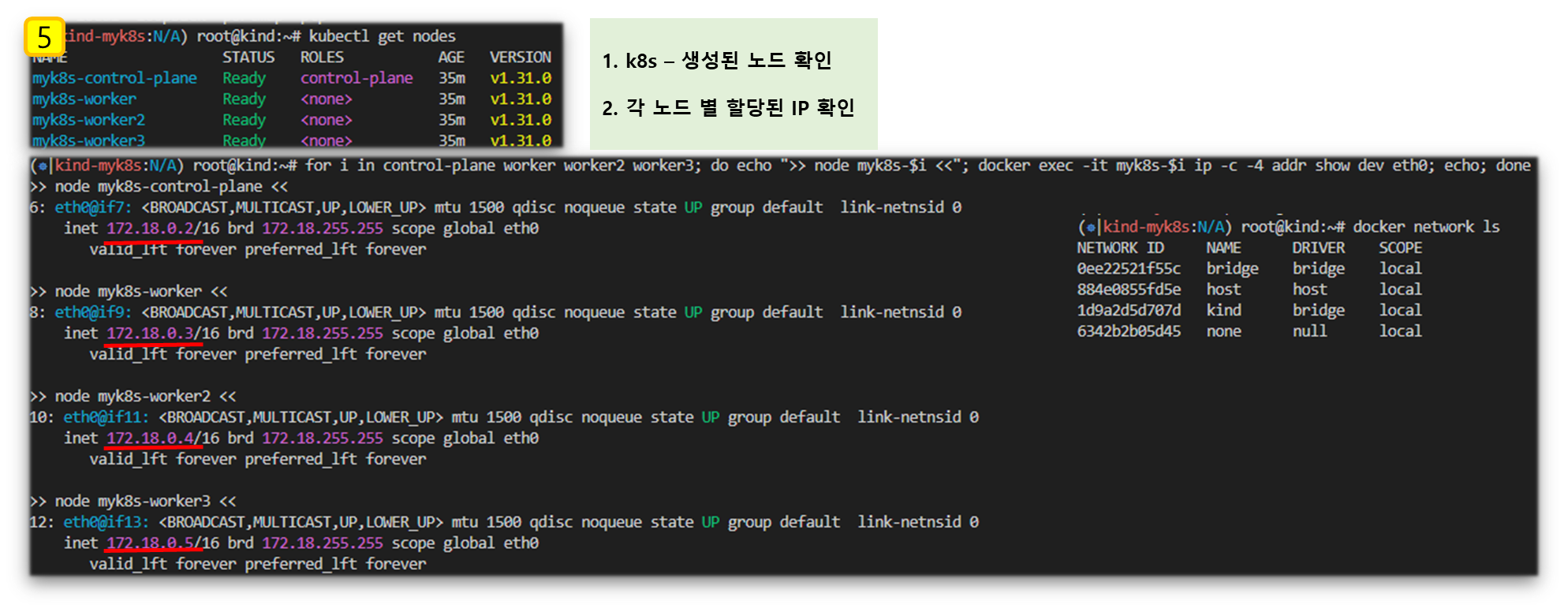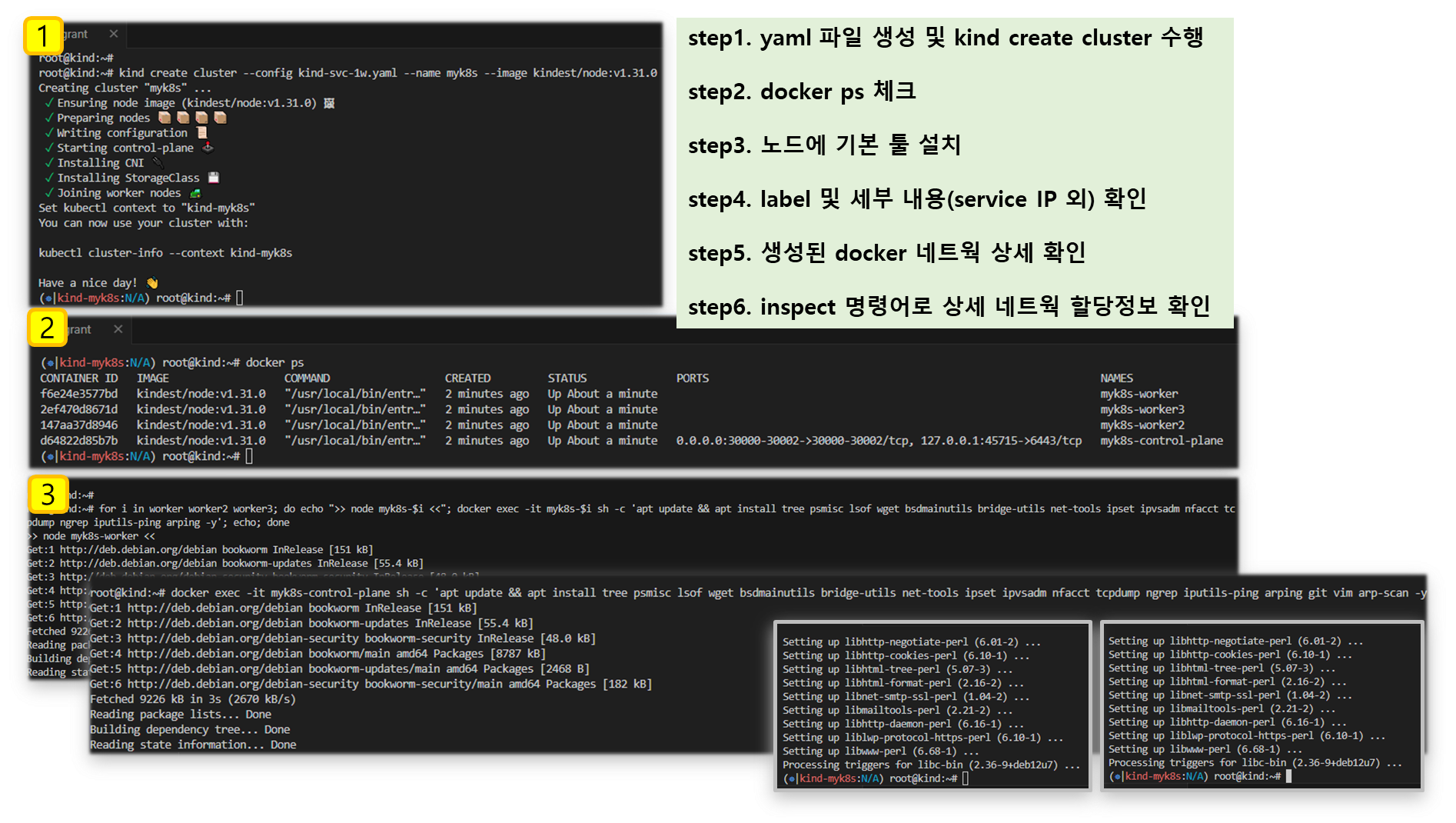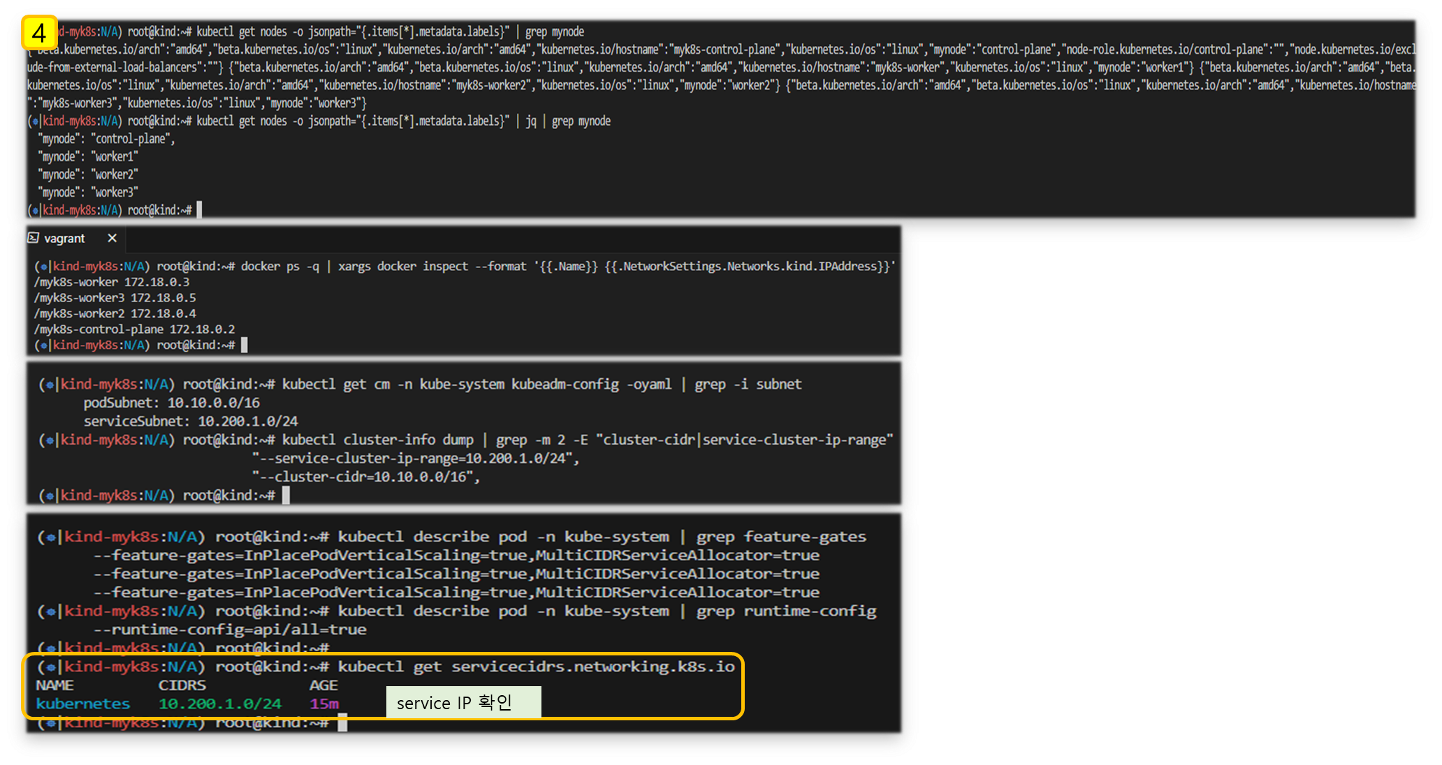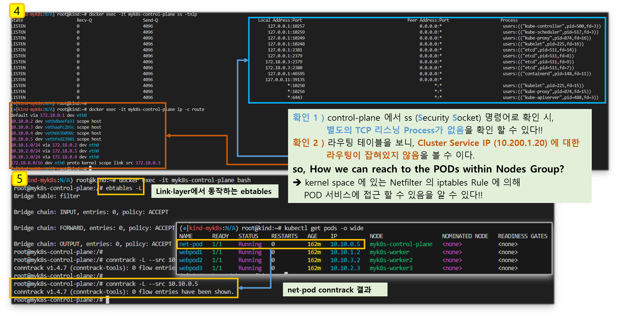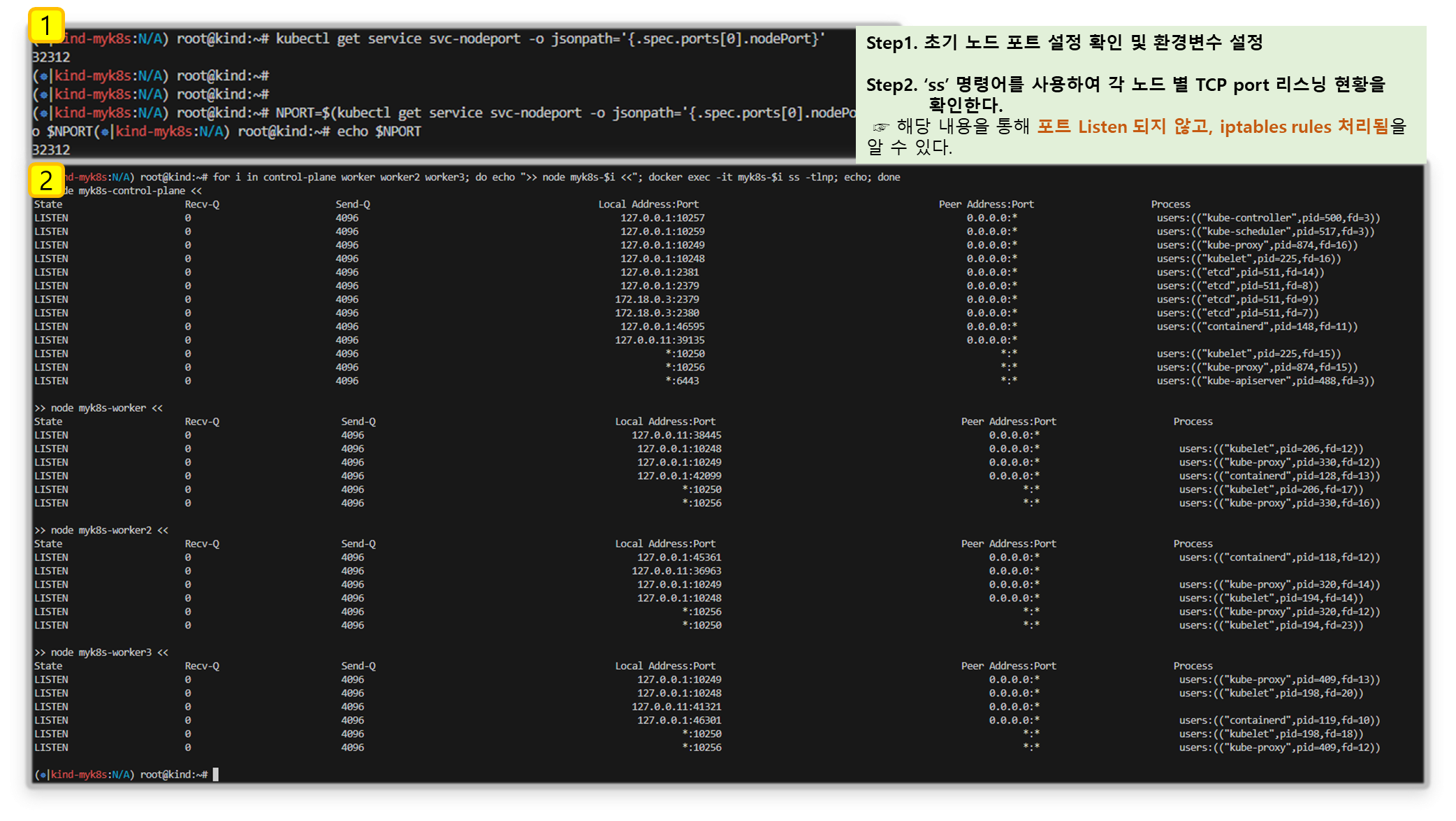 for i in control-plane worker worker2 worker3; do echo ">> node myk8s-$i <<"; docker exec -it myk8s-$i ss -tlnp; echo; done
