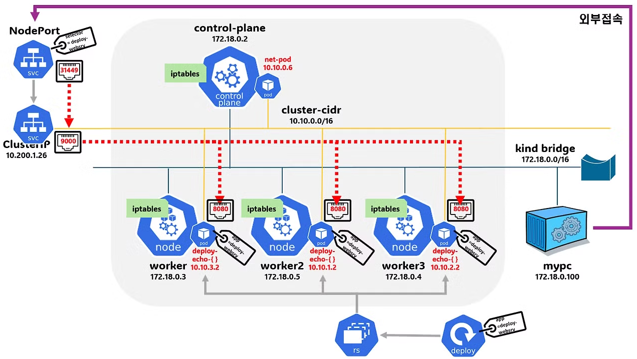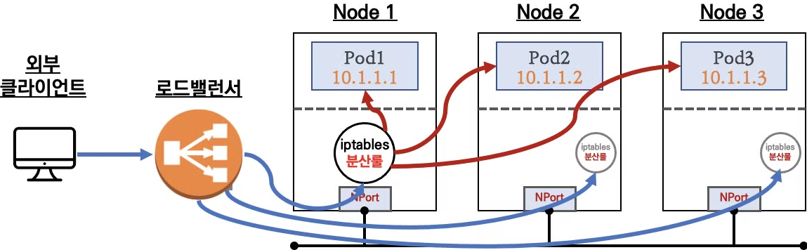 - NodeIP:NodePort 형태로 요청하여 클러스터 외부에서 NodePort 서비스에 접근할 수 있다.