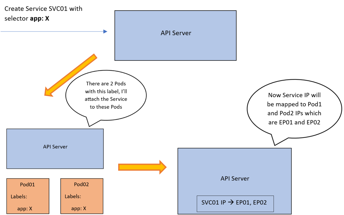 API Server는 Endpoint 라는 추상화 계층을 생성하고, svc01 은 2개의 Endpoint 즉, PODs 와 연동된다.