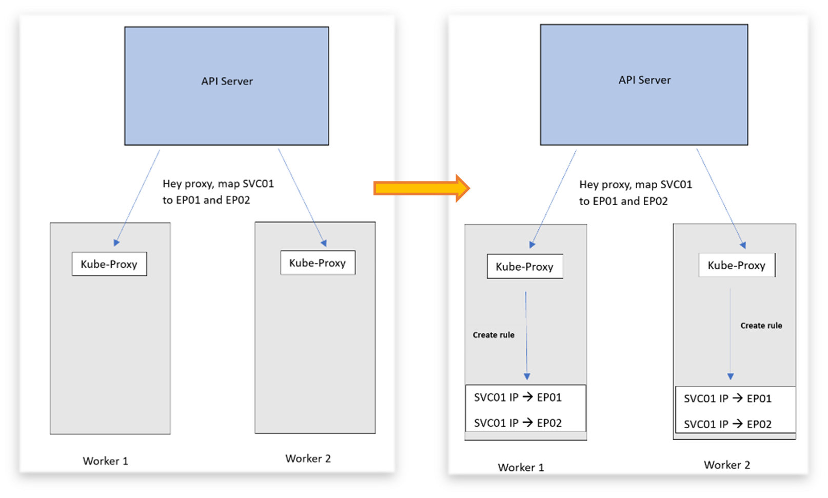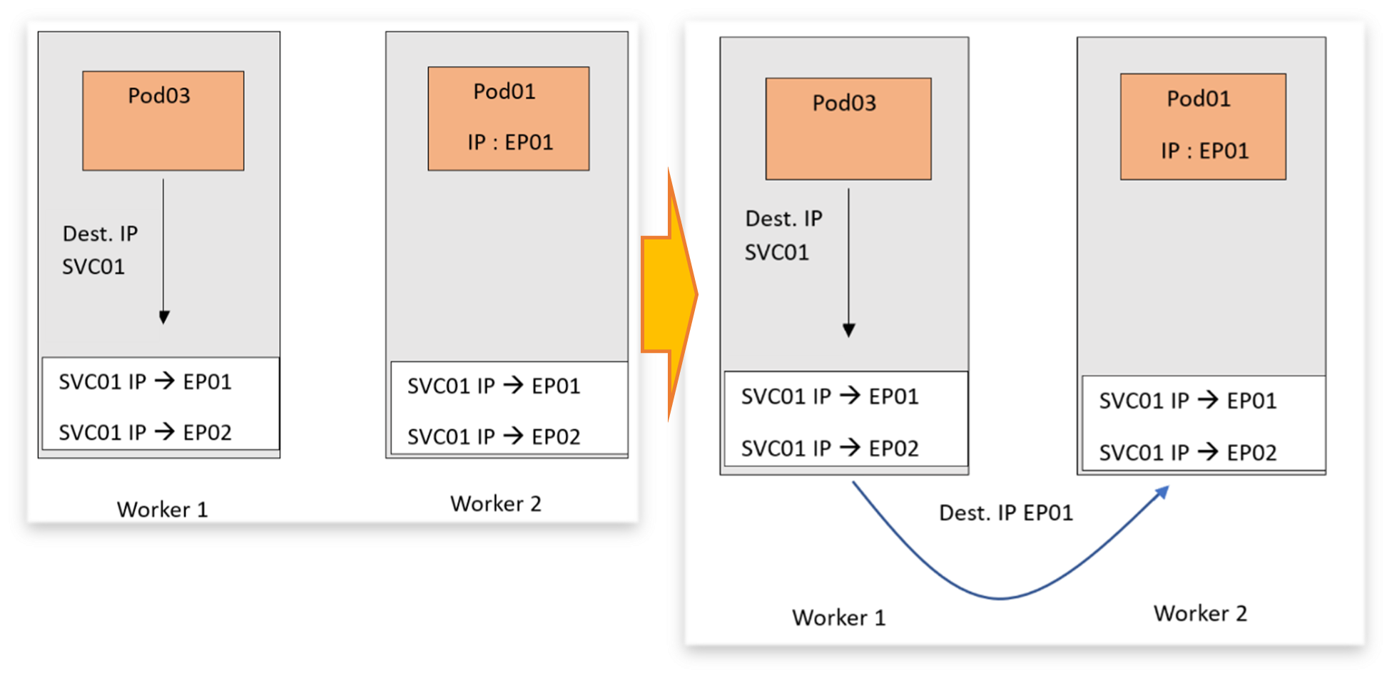 EP01, EP02로 전달된다. 이 과정에서 각 노드에 있는 kubu-proxy가 연결 중계자 역할을 하게 된다.
